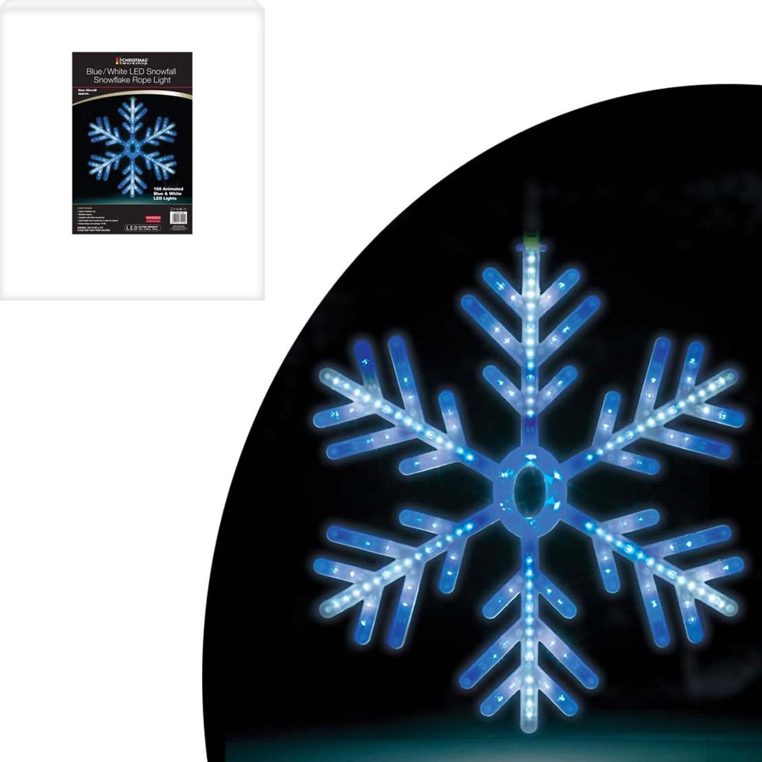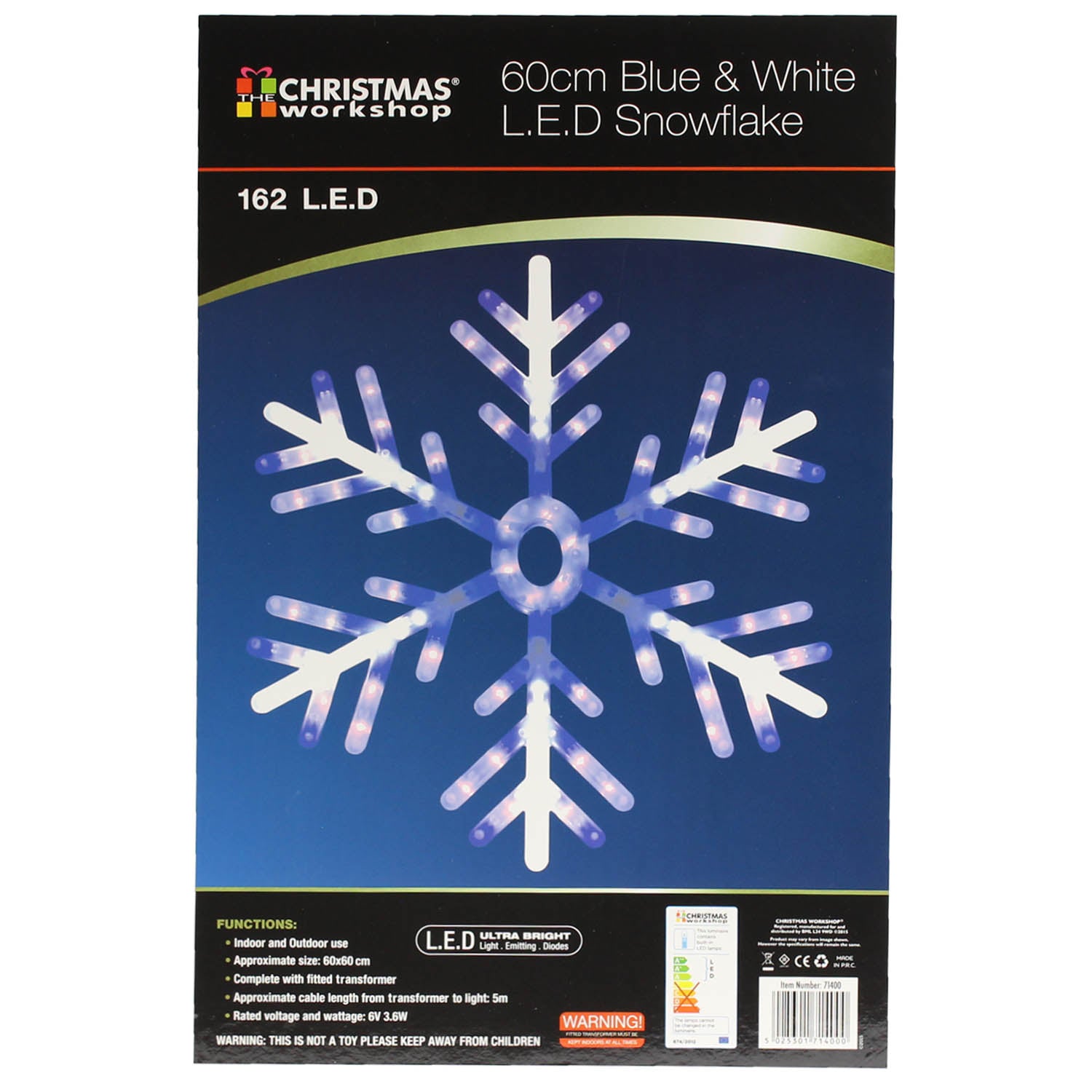 A beautiful feature for any garden, the Christmas Workshop presents this fantastic 60cm snowflake led light. The bright blue and white LEDs that light the center and 6 arms of the snowflake are in blue giving a great mixed effect when lit. The snowflake has a function to 'snow' as the lights can turn off and on in an order from top to bottom to give the effect as well as being statically on. Product Dimensions: 60x60cm.