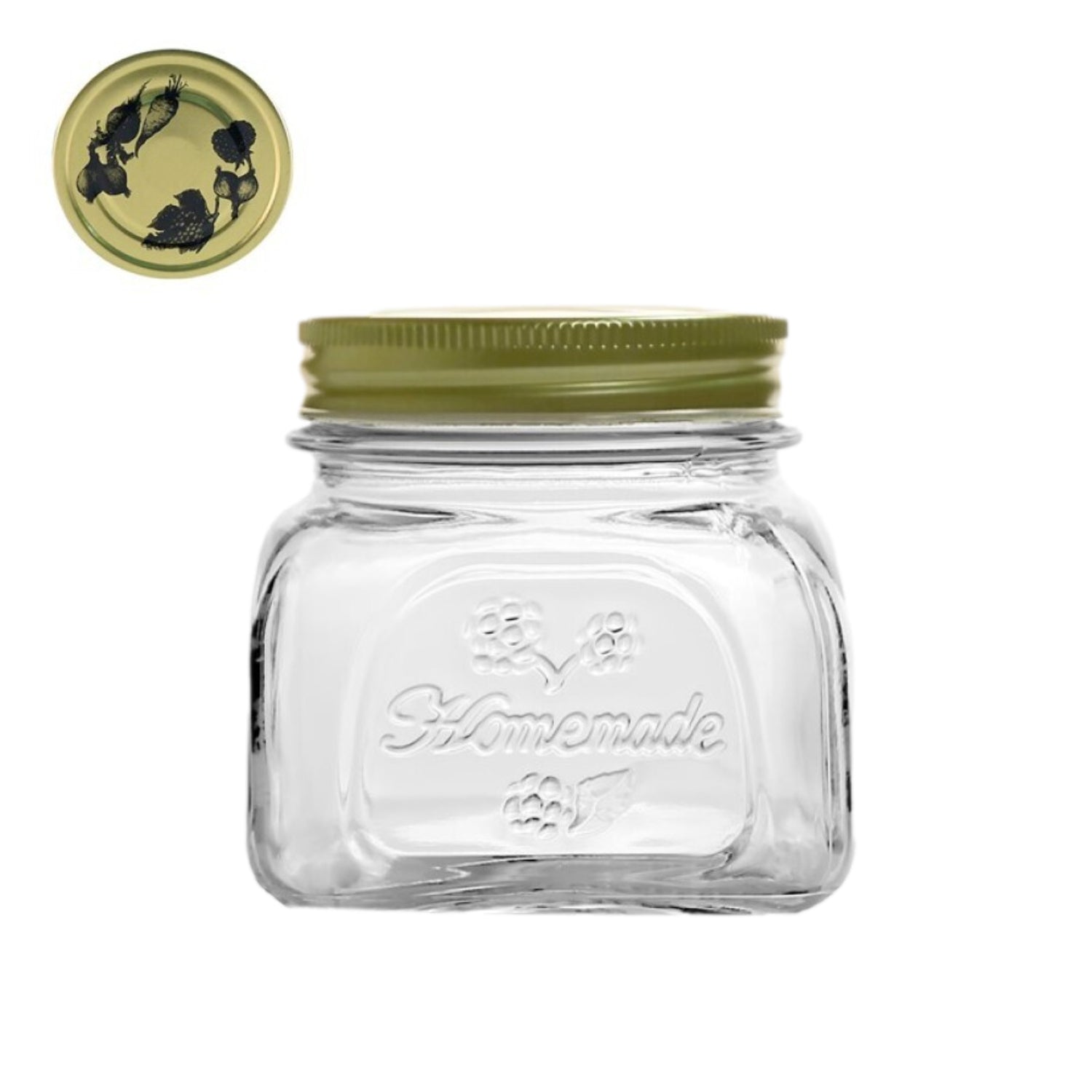 This 300 ml square glass jar with a gold screw-on lid is perfect for storing homemade jams, sauces, spices, and dry goods. Its clear glass body allows easy visibility of contents, while the embossed “Homemade” text and floral design add a decorative touch. Compact and stylish, it’s ideal for both practical storage and as a gift.