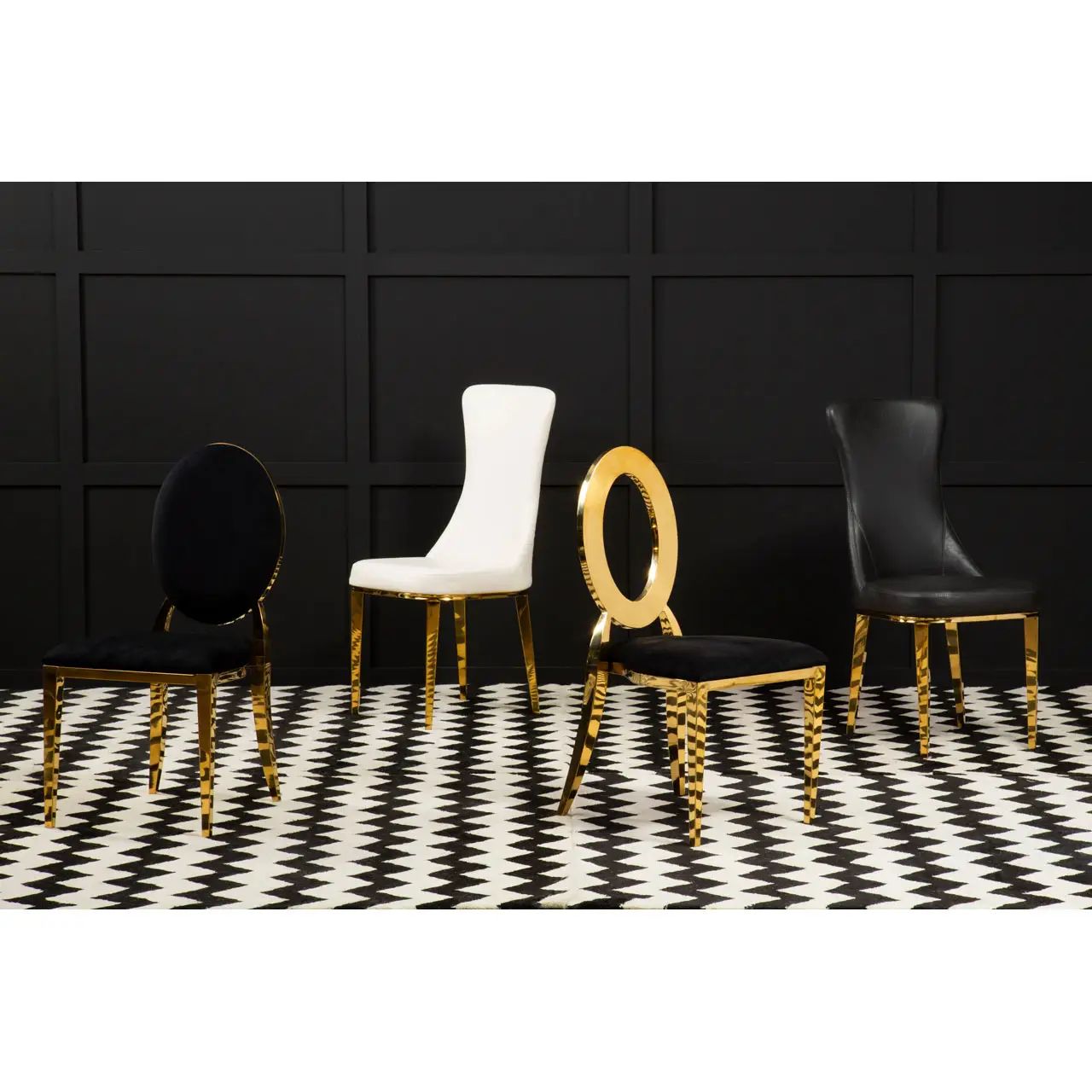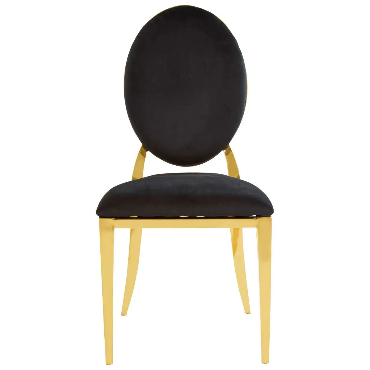 These chairs make a statement with their stainless steel frame in a rich gold finish, adding a touch of luxury. The black velvet seat and oval backrest beautifully complement the smooth, angular lines of the frame