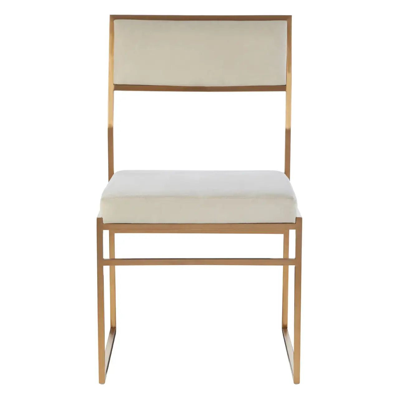 Crafted from steel, its minimal frame boasts a brushed gold finish. The seat and backrest are upholstered in milky white velvet, adding a subtle touch to its design.