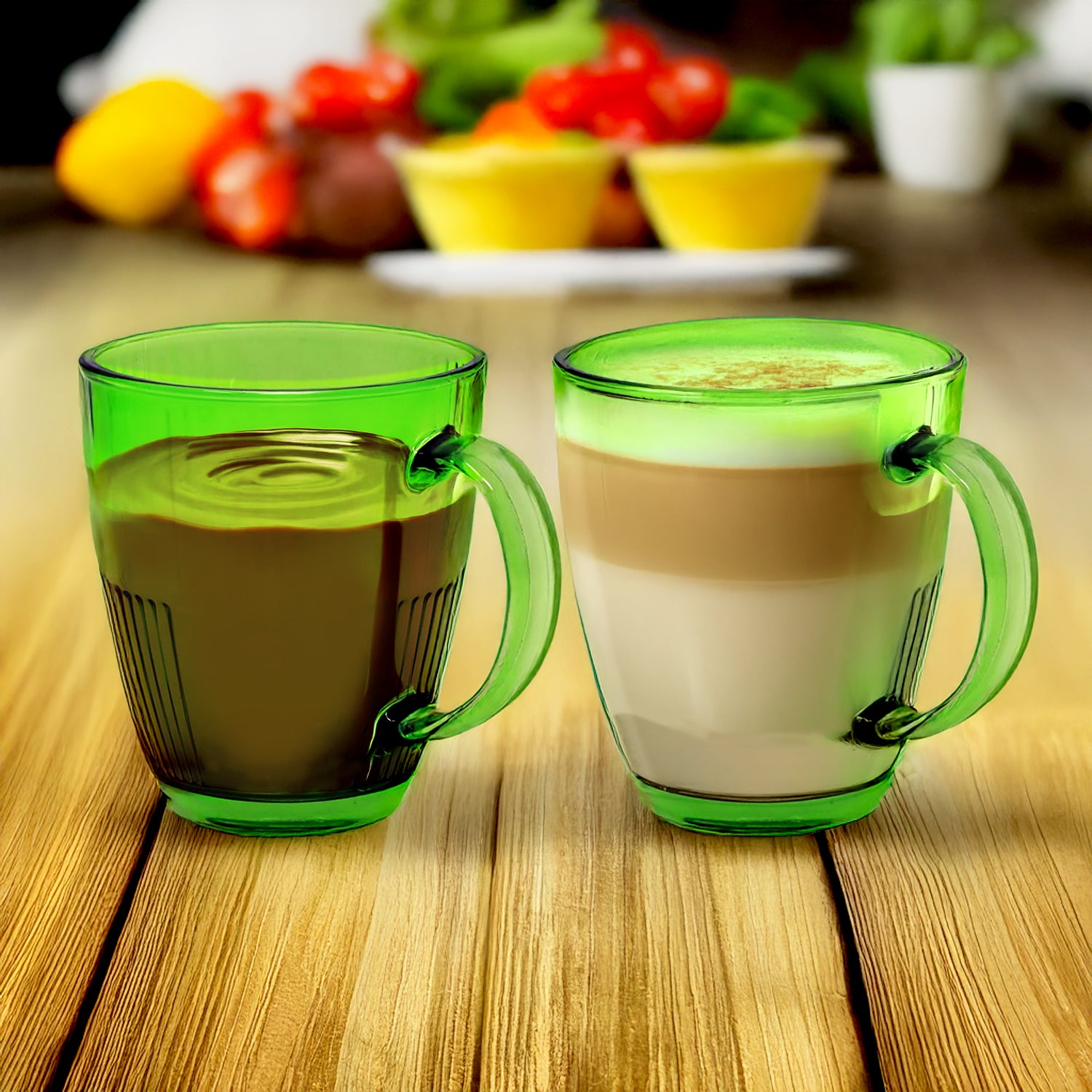 This 350ml coloured glass mug set combines style and durability, perfect for enjoying coffee, tea, or hot beverages. Also available in vibrant red and blue colours.