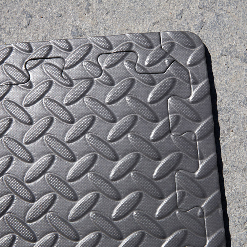 6 piece EVA foam grey floor tiles set. Easy to assemble. Provides an insulating, comfortable and shock-absorbing surface. Each tile 61 x 61 x 1cm. Covers 2.16sqm. Shrink-wrapped with a full-colour insert label.