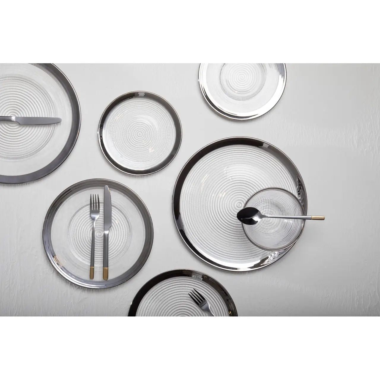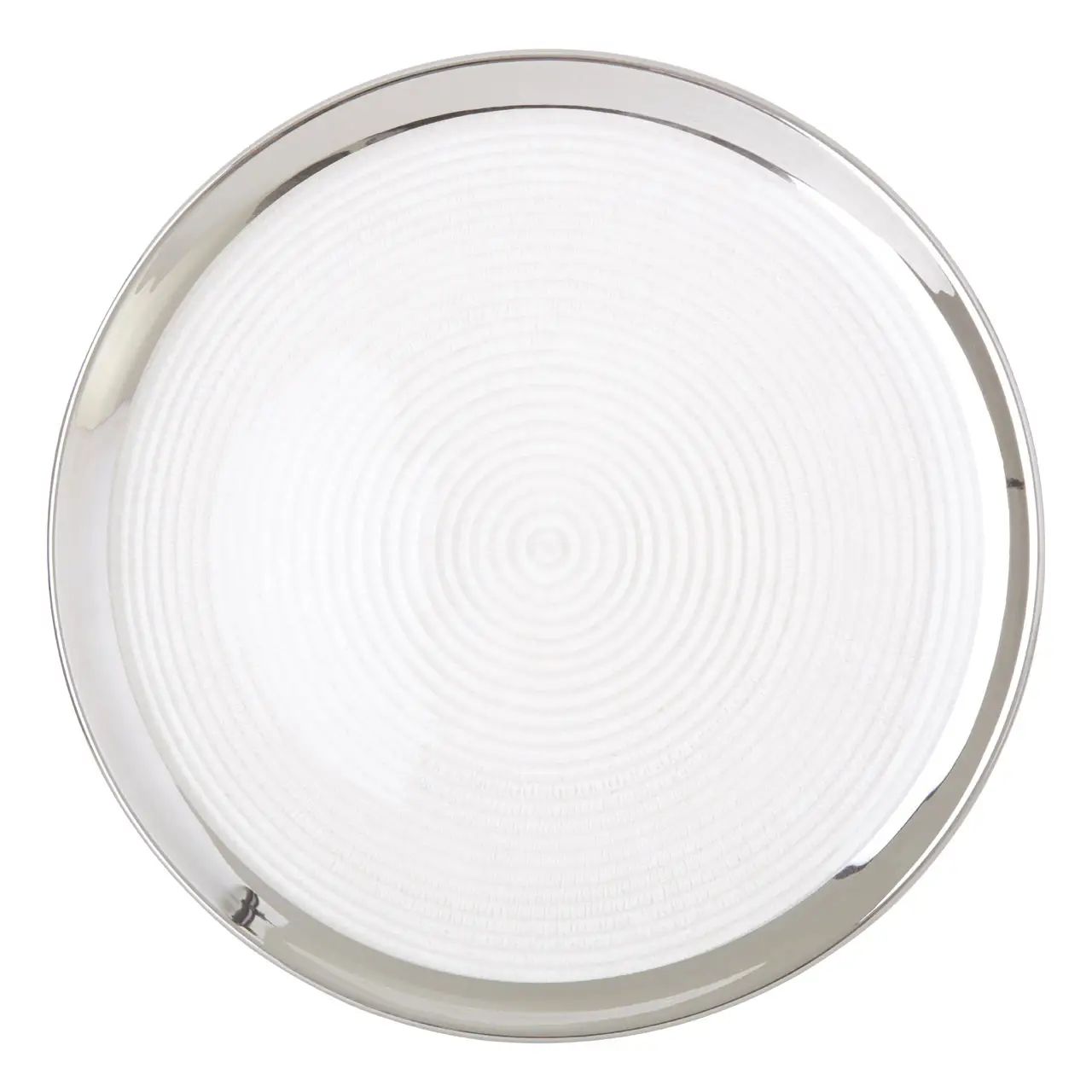With an embossed spiral texture, these clear glass coupe charger plates add sophistication to the dining table. Its understated design is complemented by a silver edge, enhancing its modern aesthetic.