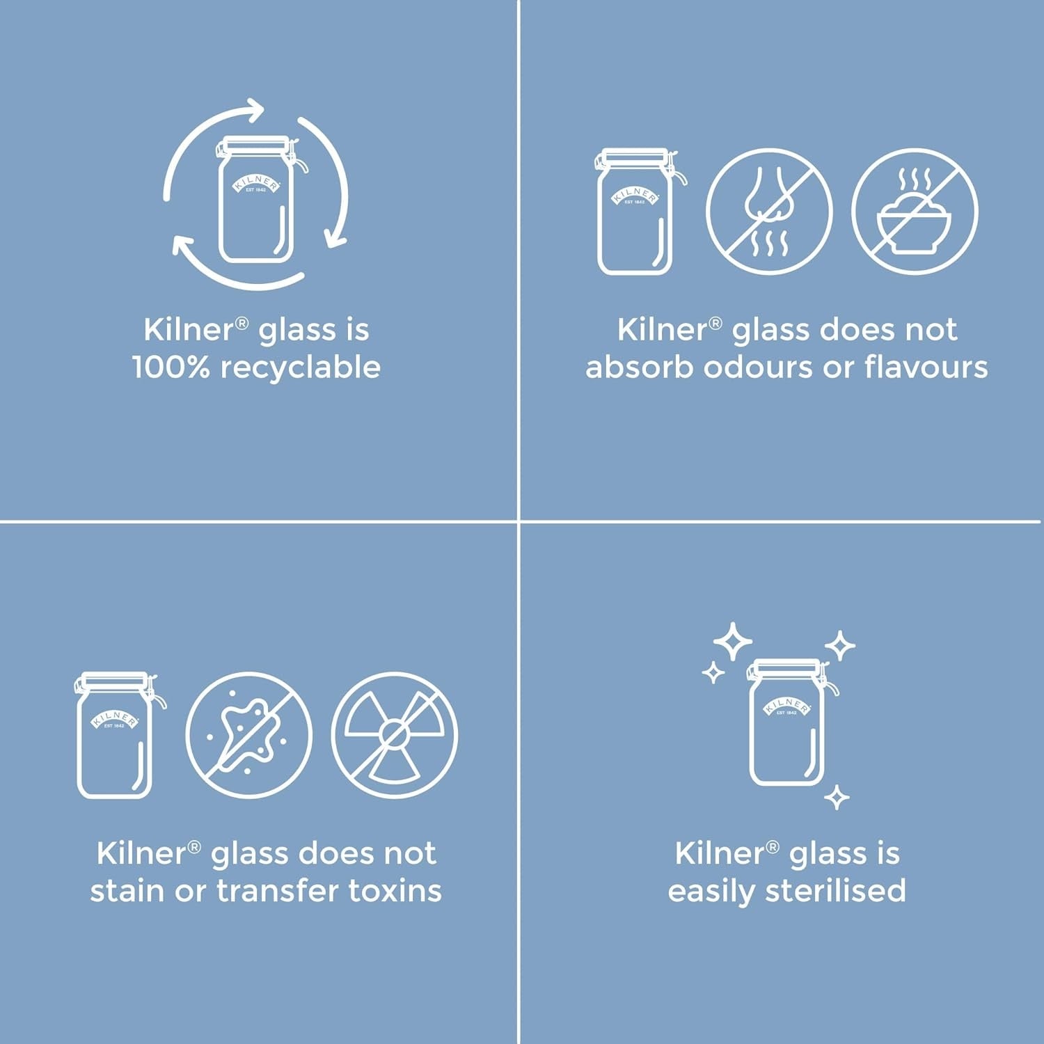 Keep your ingredients fresh and neatly stored with the Kilner 6-piece 125ml glass storage set. These small round jars feature a secure clip top lid with an airtight rubber seal; perfectly sized for preserving mustards, chilli pastes, and terrines, they’re also great for storing dry foods such as spices, herbs, seeds, rock salt, peppercorns, and cake decorations. Reusable, dishwasher safe, and eco-friendly, this set offers both practicality and timeless style for any kitchen.