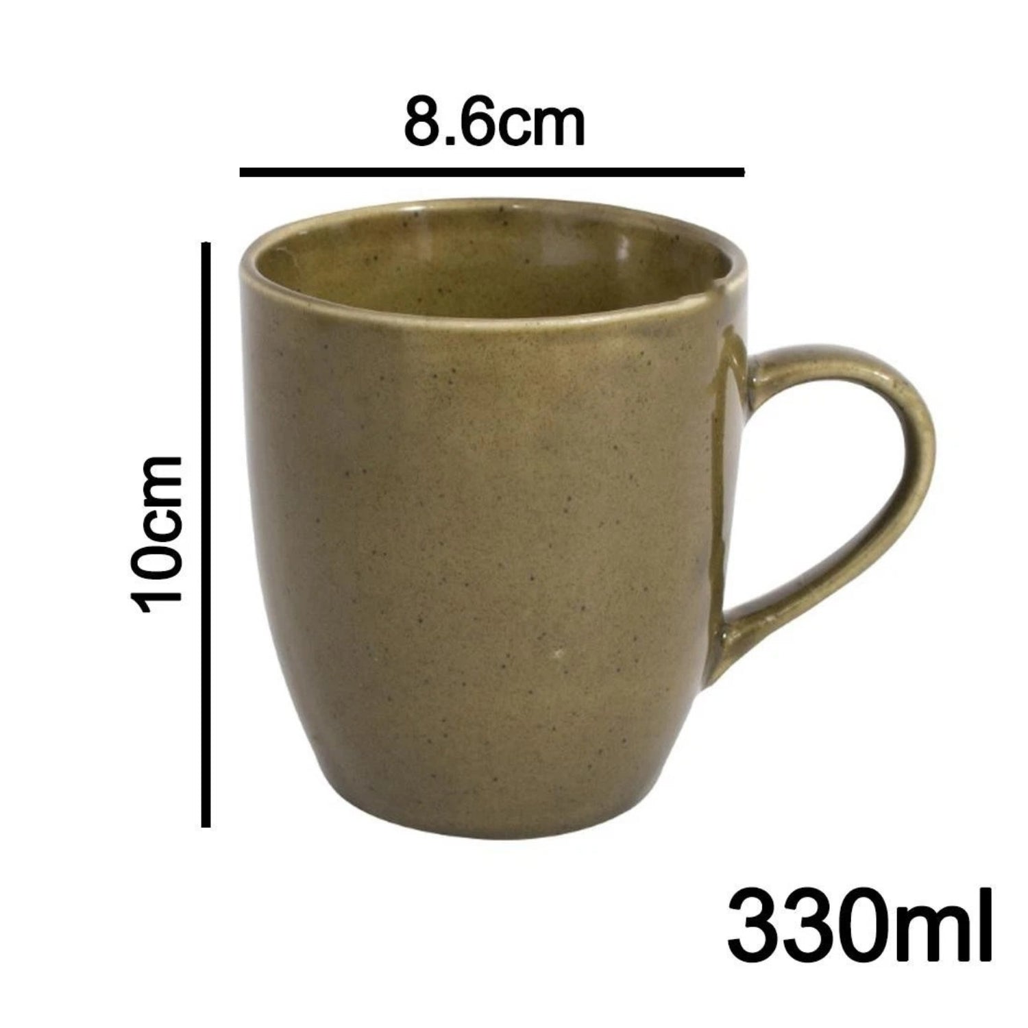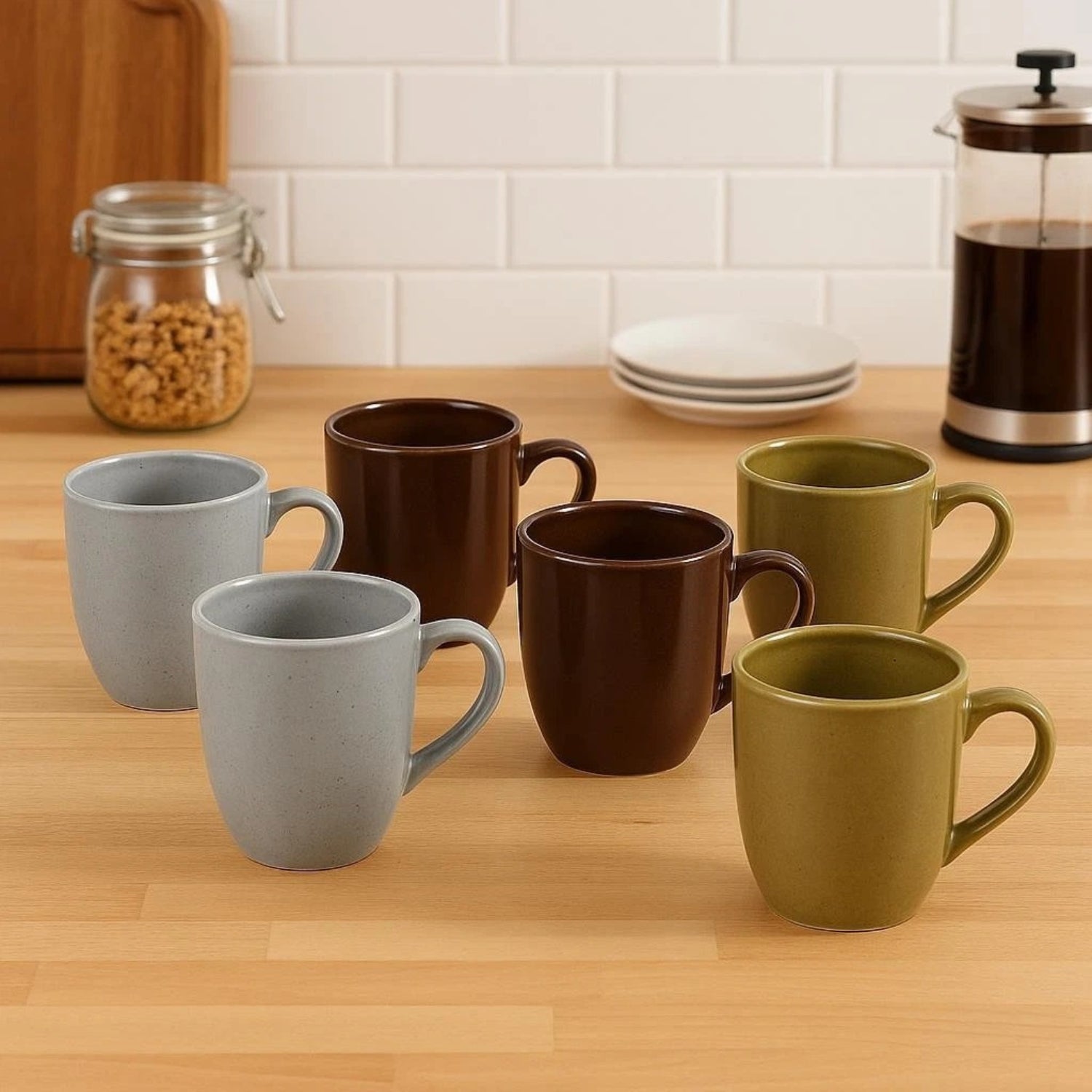 - Set of 6 mugs with 2 grey, 2 brown, and 2 green reactive glaze finishes.