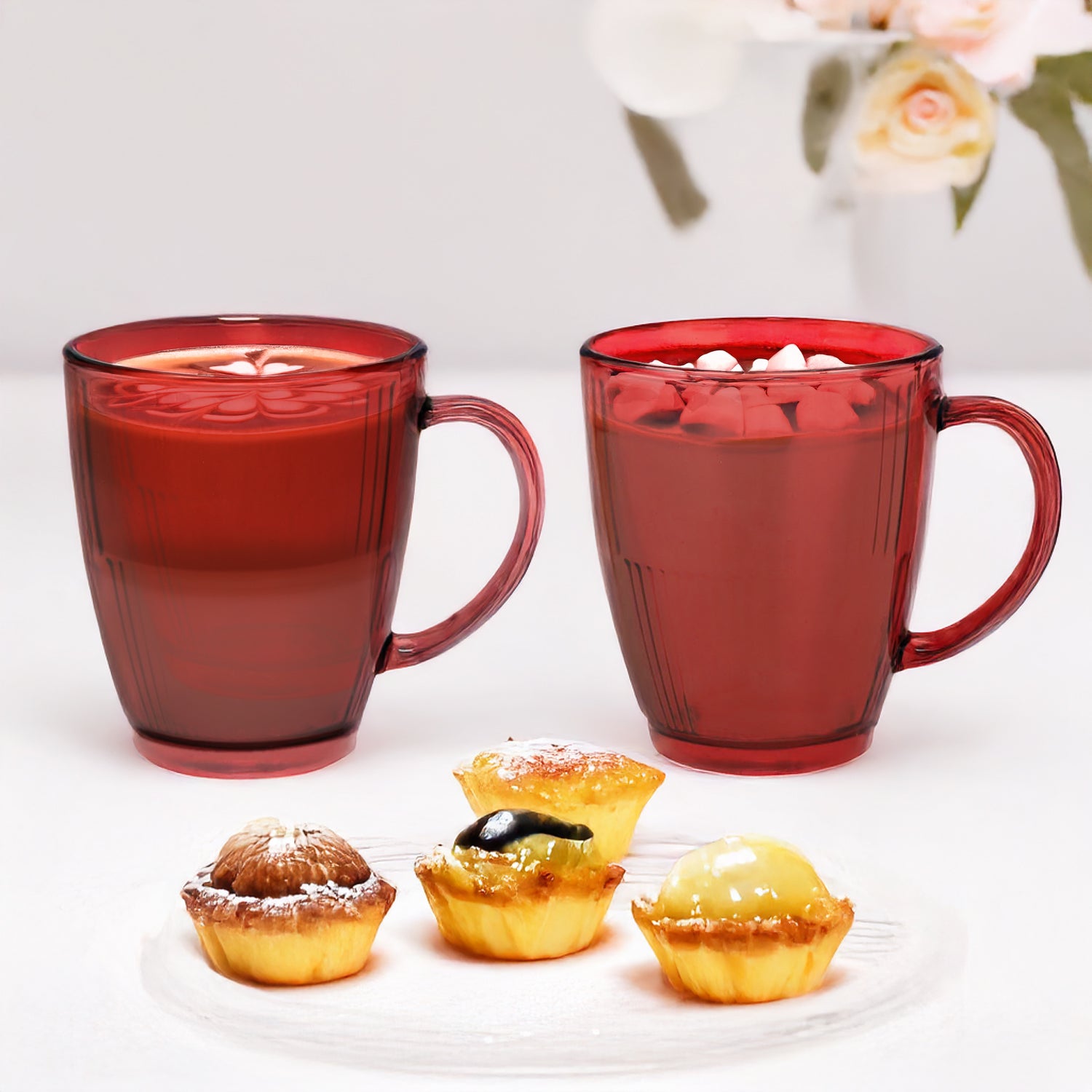 This 350ml coloured glass mug set combines style and durability, perfect for enjoying coffee, tea, or hot beverages. Also available in vibrant blue and green colours