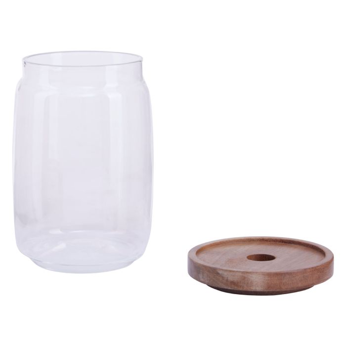 - Airtight Wooden lid keeping moisture away from the food. Wide neck for easy access on the inside of the glass.