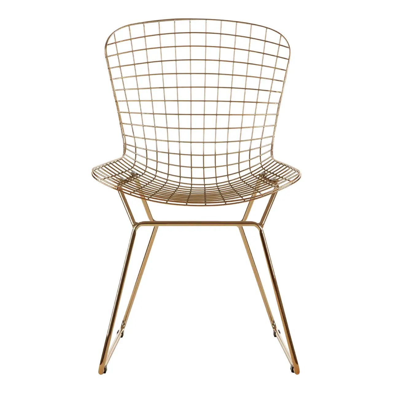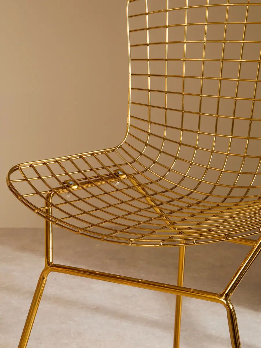 These stylish chairs, crafted from durable metal, features a rich, reflective gold finish. Its wireframe structure offers an open and airy aesthetic, while the slightly upturned sides of the seat complement the rounded lines of the backrest. Slim tubular metal legs enhance the chair's minimalistic appeal.