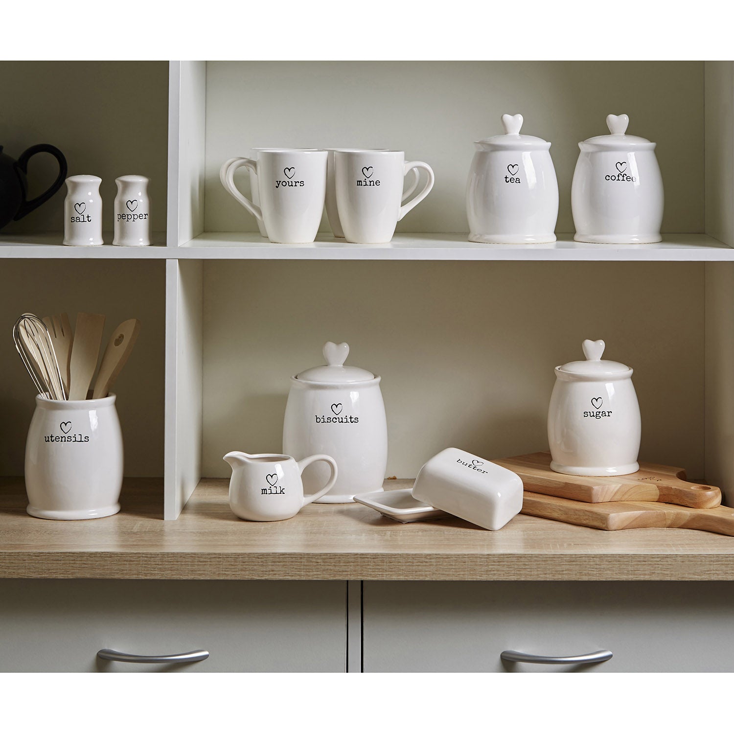 Bringing a kindly touch to your countertop, the charm canister set, with love heart detail and lid, will help to keep your kitchen organized and tidy. Made from durable white dolomite, the canister features an elegant love heart design and worded detail, giving the jar a gentle style, while ensuring easy identification. Matching the canister is the delightful lid, which is accentuated by the love heart handle, that fits neatly on top, helping to keep your tea bags and leaves fresh for longer. Complementing most decors, the charm canister will add a fresh look to your kitchen while ensuring your everyday essentials are close at hand.