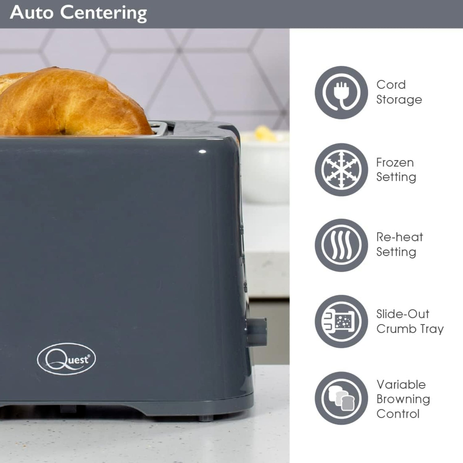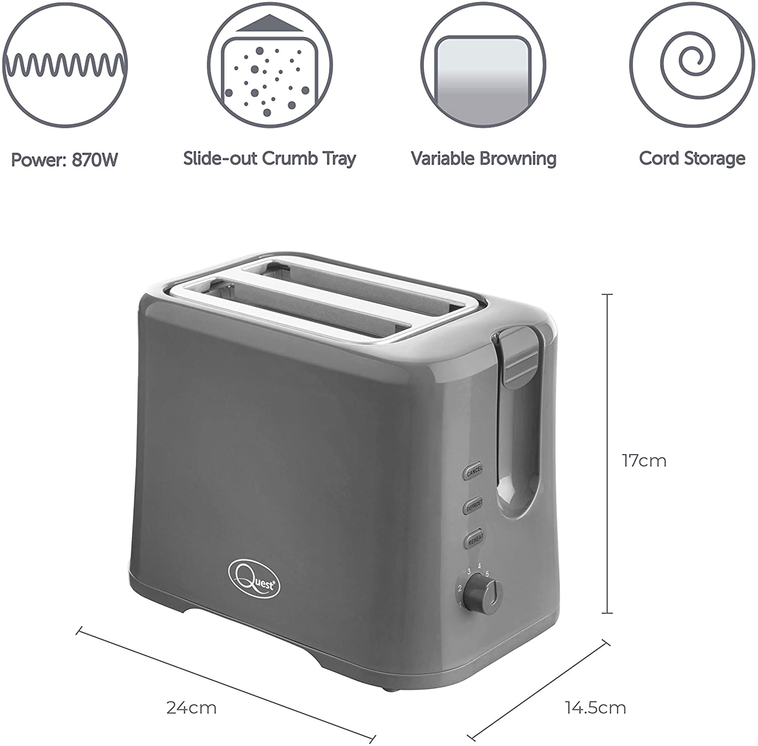 Quest 870W Grey 2 Slice Compact Toaster