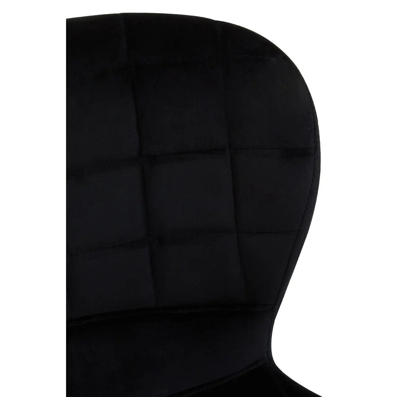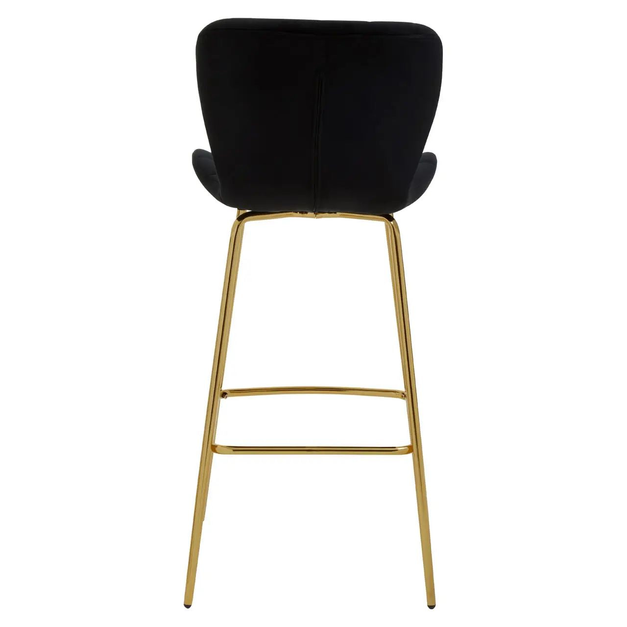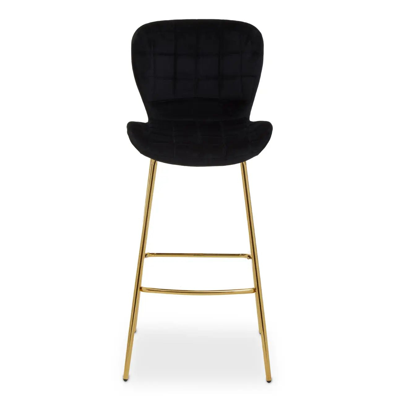 This bar chair, upholstered in sumptuous black velvet, features quilted seat and backrest with fine stitching. Its modern design is complemented by splayed gold-finished legs and footrests, adding to its clean aesthetic.