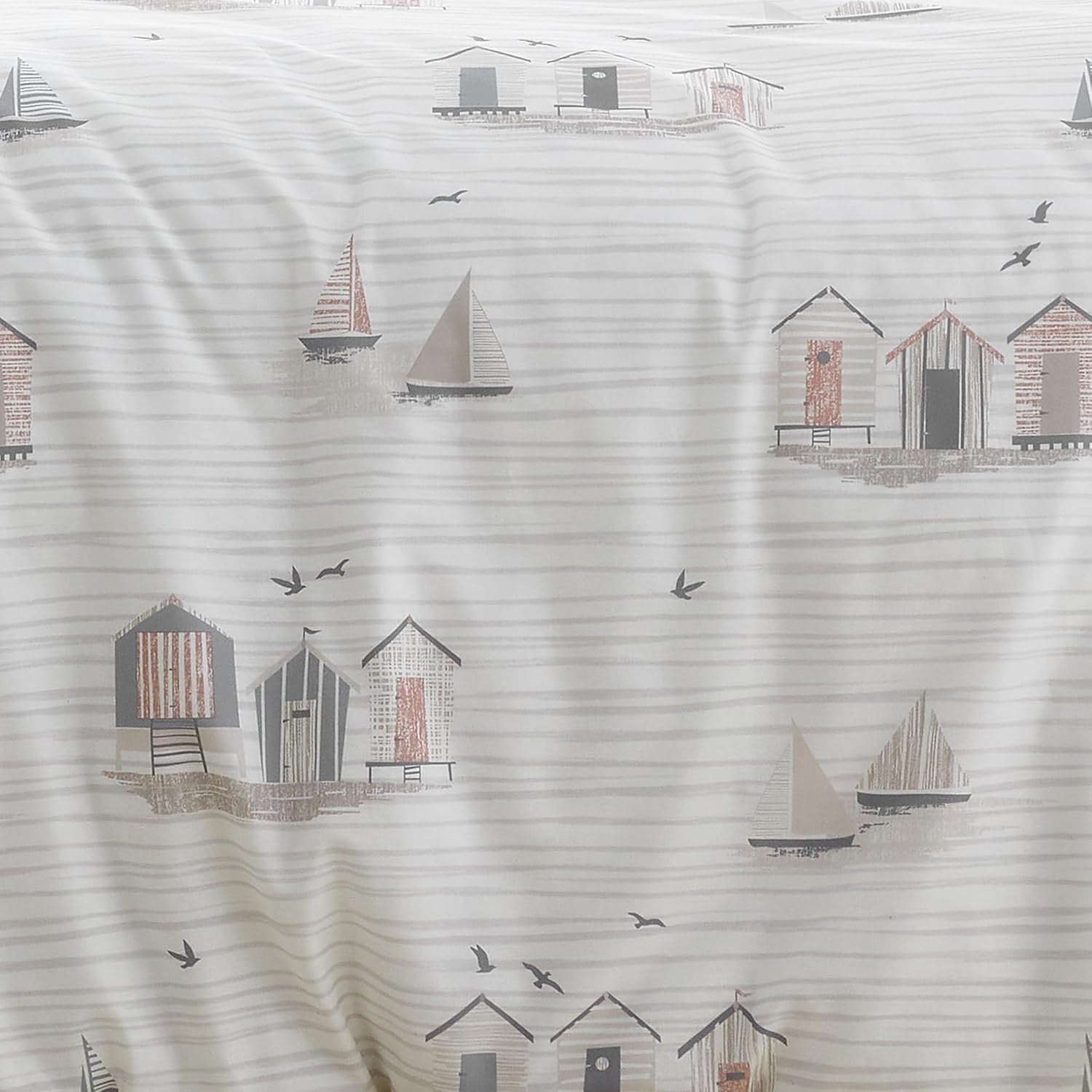 This luxury and reversible duvet cover has beach huts and boats illustrations on it and seagulls images at the reverse. This coastal themed design is manufactured from easy-care polycotton. Material: 48% Cotton & 52% polyester, it is machine washable. This set includes 1 x king duvet cover and 2 x pillowcases, duvet cover size is 230cm x 220cm (91" x 87") (Approx) and each pillowcase size is 48cm x 74cm (19" x 29")(Approx).