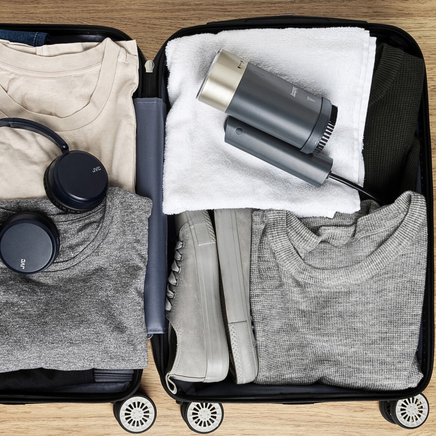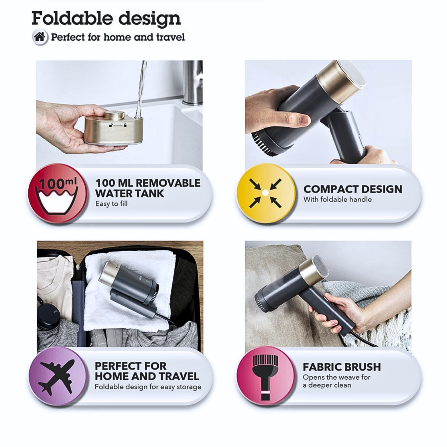 - The handle folds down against the steamer head, ensuring compact storage, making it perfect for carrying in a suitcase or keeping in a caravan.