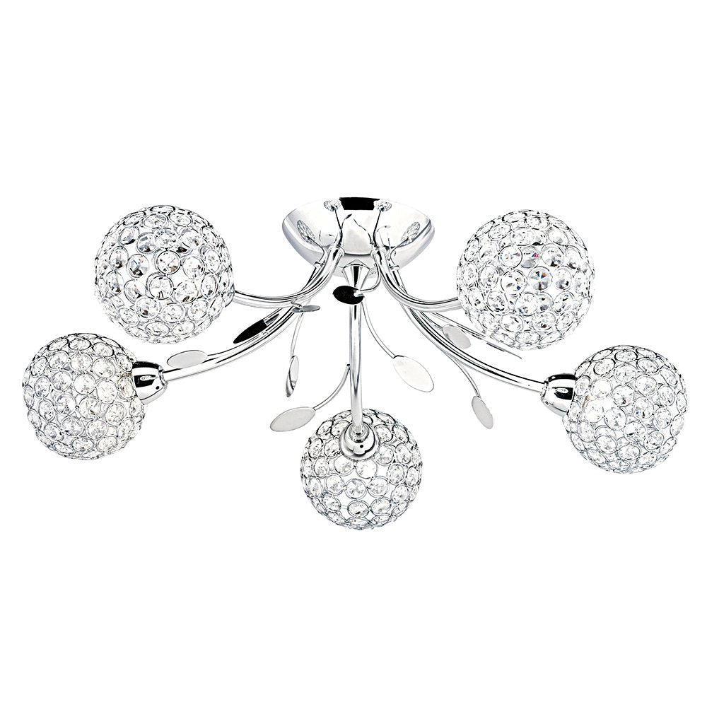 This Bellis II chrome 5 light fitting with clear glass shades and leaf decoration looks beautiful on any bedroom, living room, dining room or kitchen ceiling. The ornate chrome finish fitting features five elegantly crafted flower head spheres, made from chrome finish hoops and clear glass buttons, which look stunning and create a fabulous lighting effect.