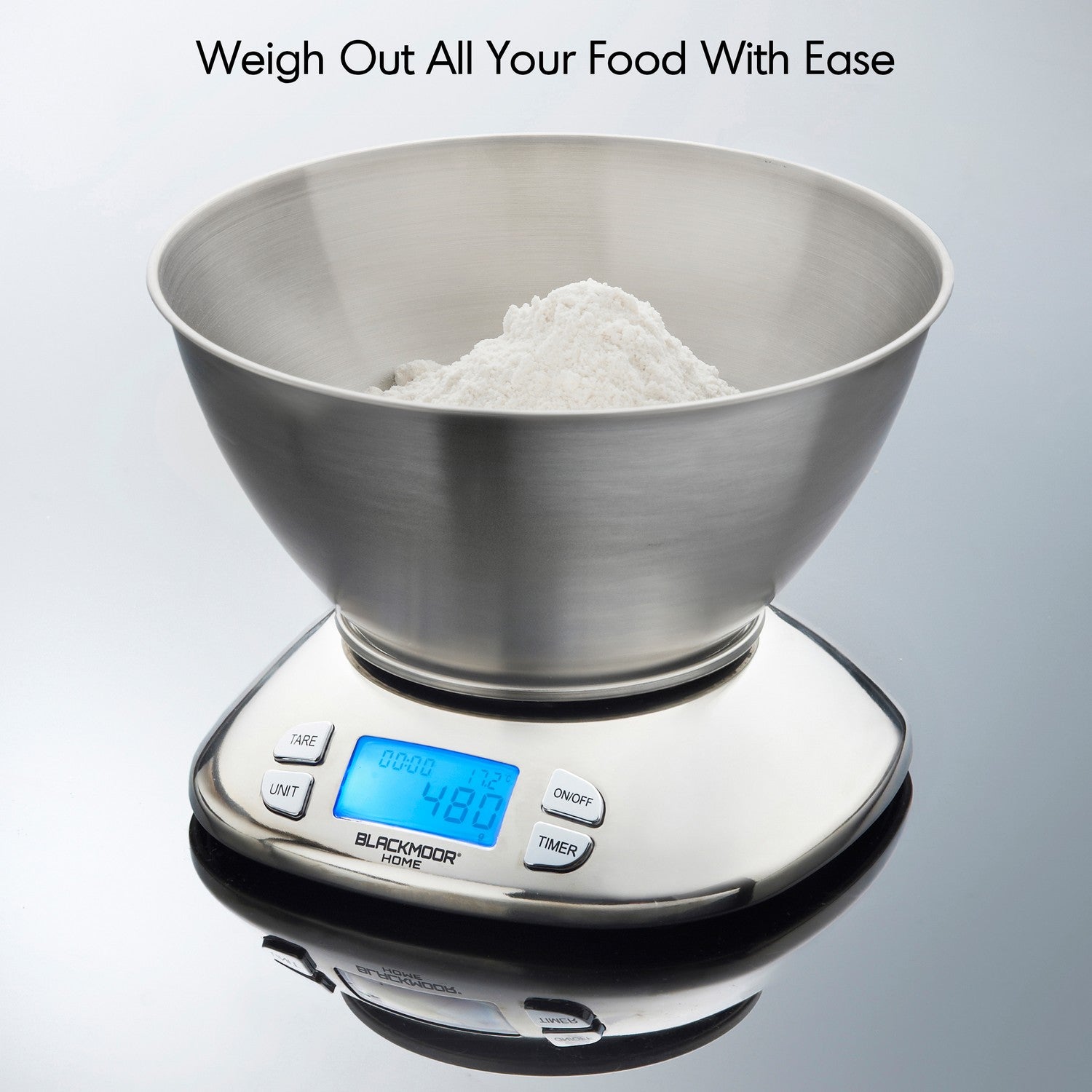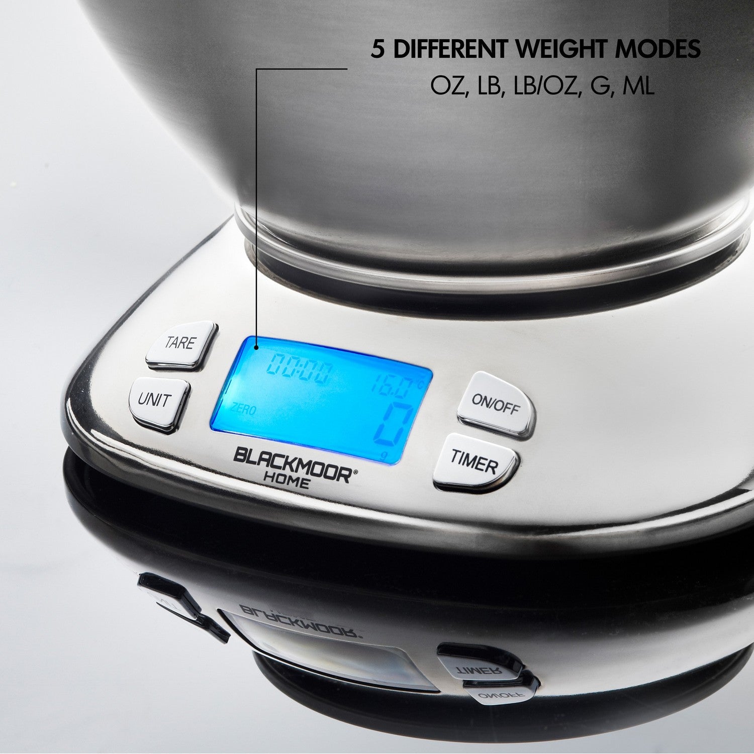 - Feature a digital display with timer function and 5 different weight modes (oz, lb, lb/oz, g, ml)