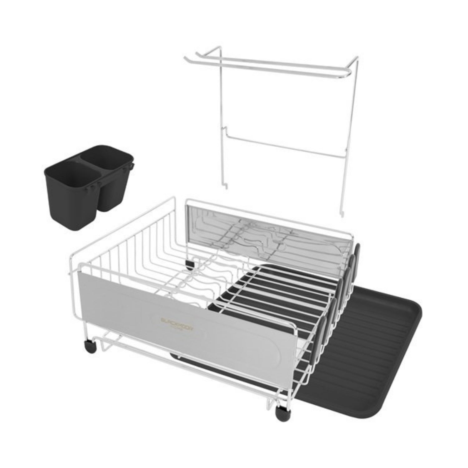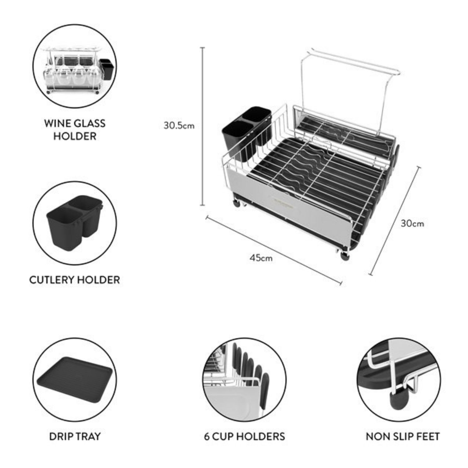 The Blackmoor Stainless Steel Dish Drainer is a stylish and practical solution for drying dishes in your kitchen. Built with a strong stainless steel frame, it offers excellent resistance to rust and corrosion. The removable drip tray keeps your counters free from excess water. With holders for cutlery, cups, and wine glasses, it provides plenty of organised space for all your washing-up.