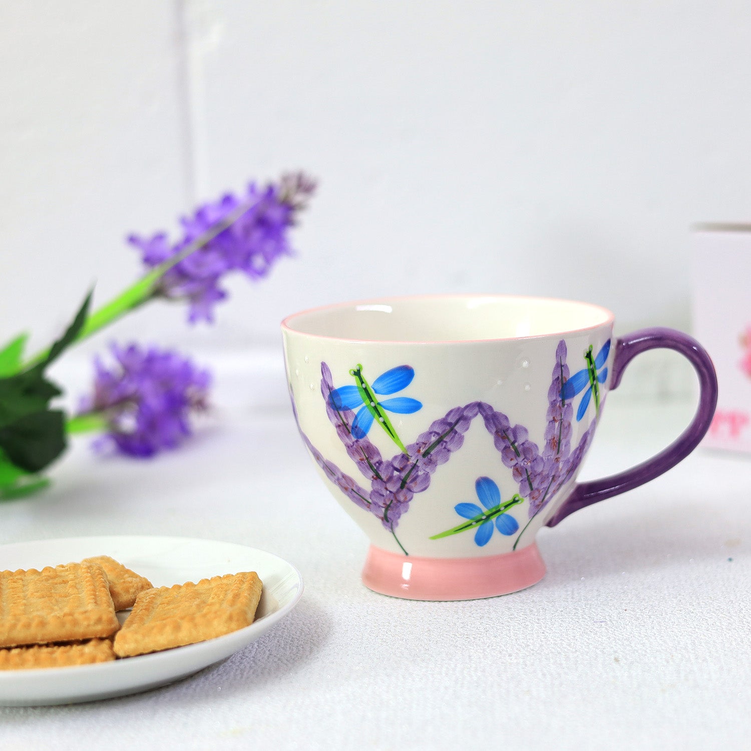 - Lovely tea cup hand painted with Lavender flowers and Blue dragonflies