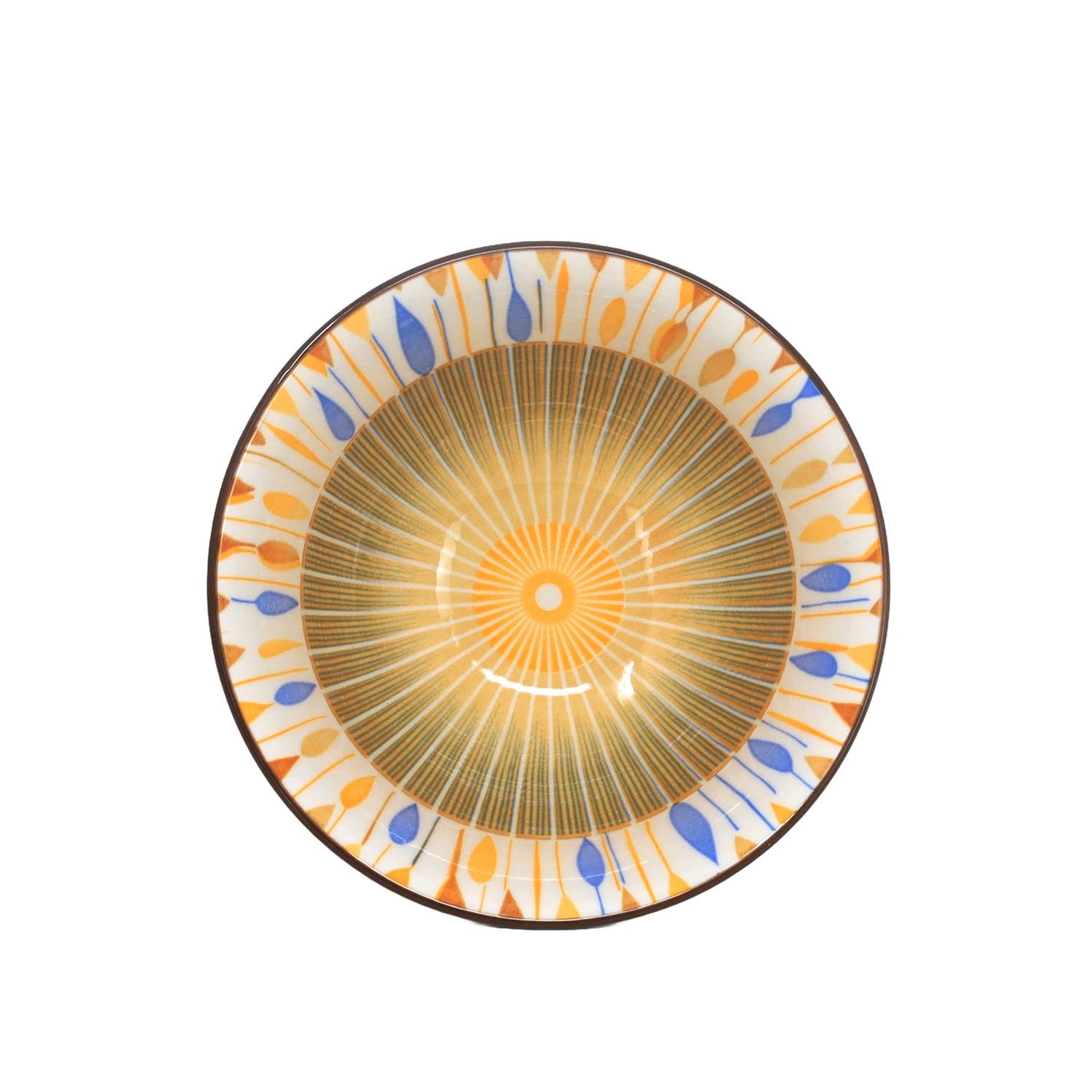 Add a touch of elegance to your tableware collection with this 15 cm ceramic bowl, beautifully designed with a colorful leaf motif and a radiant sunburst pattern inside