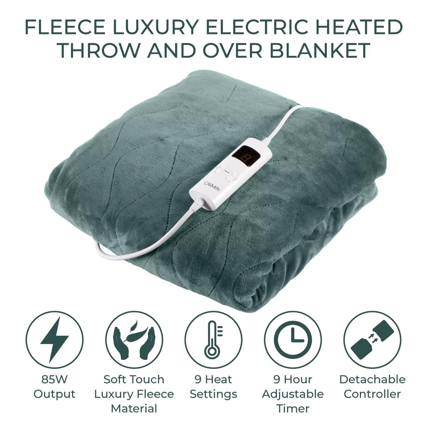 Wrap yourself in warmth with the Carmen Core C81148GRN Luxury Fleece Heated Blanket. This green fleece over-blanket combines soft 230 gsm material with high-performance heating features to deliver cosy comfort whether you're on the sofa or layering over your duvet.