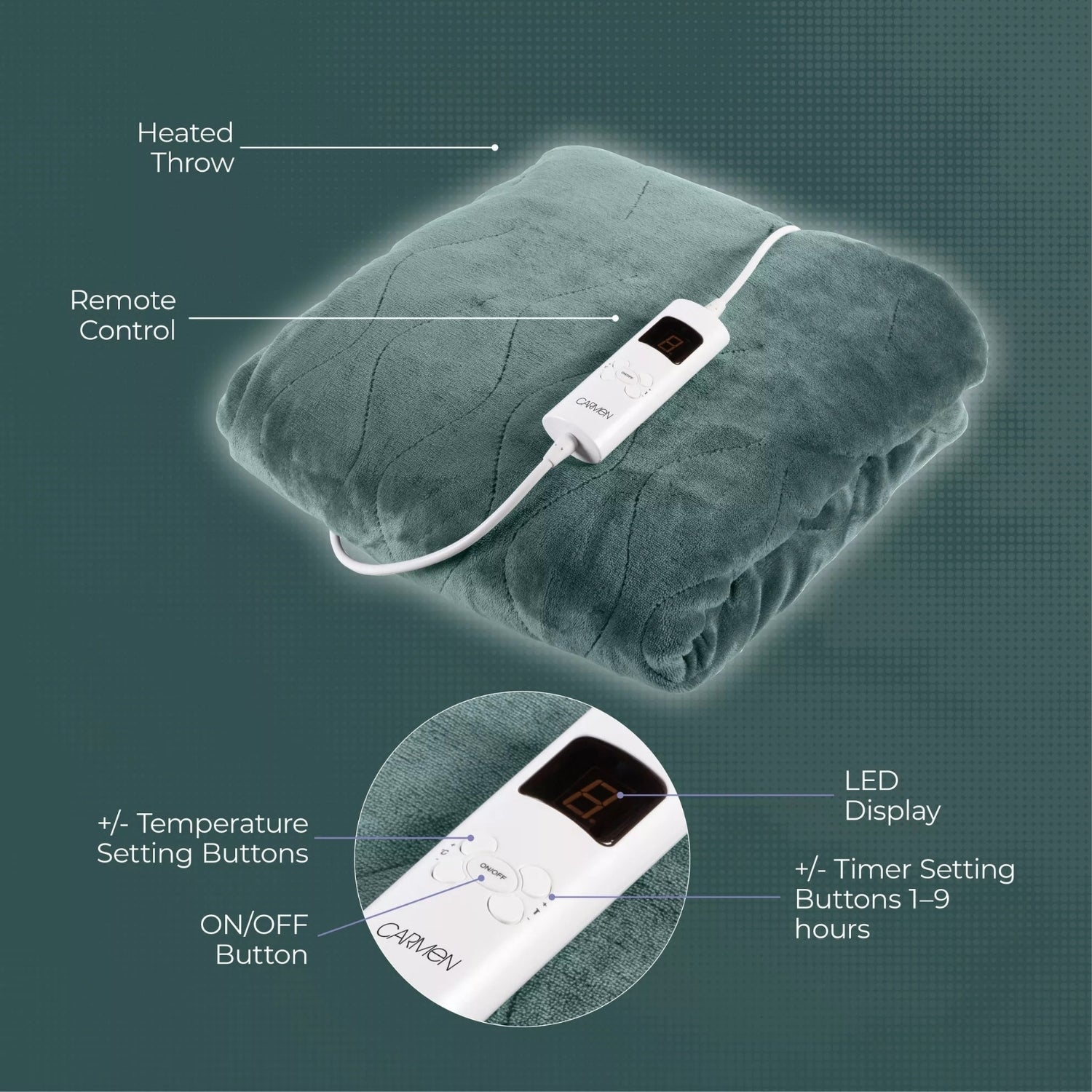 - 9 selectable heat settings for customised warmth.