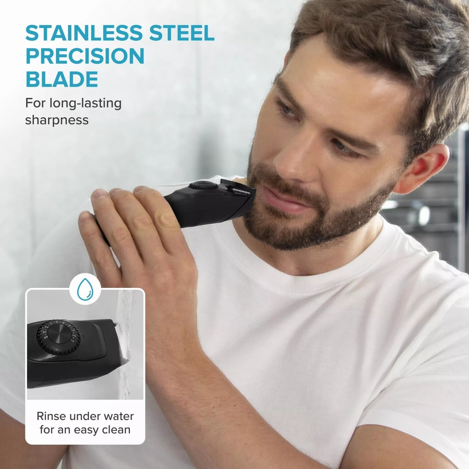 The Carmen Men’s Signature Cordless Hair Trimmer delivers professional-level trimming performance at home. With a precision stainless-steel blade and a dial offering 20 length settings from 1 to 20 mm, you can tailor your look exactly, whether you’re trimming stubble, beard, or body hair. Ideal for everyday grooming or travel, this trimmer combines precision, versatility and convenience all in one.