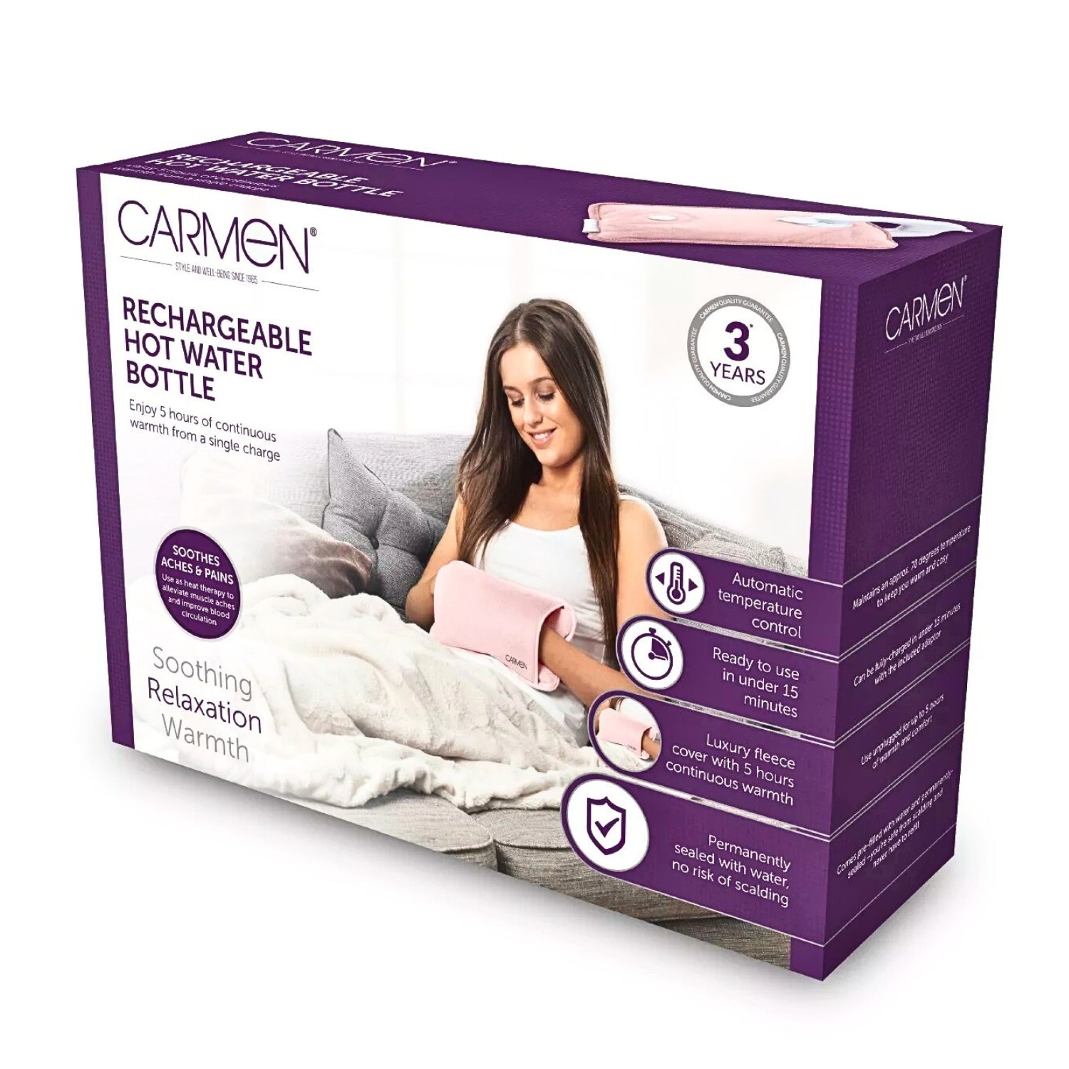 The Carmen Rechargeable Hot Water Bottle offers the perfect blend of comfort, convenience, and safety. Pre-filled and permanently sealed, it eliminates the need for boiling water, making it a hassle-free choice for everyday use.