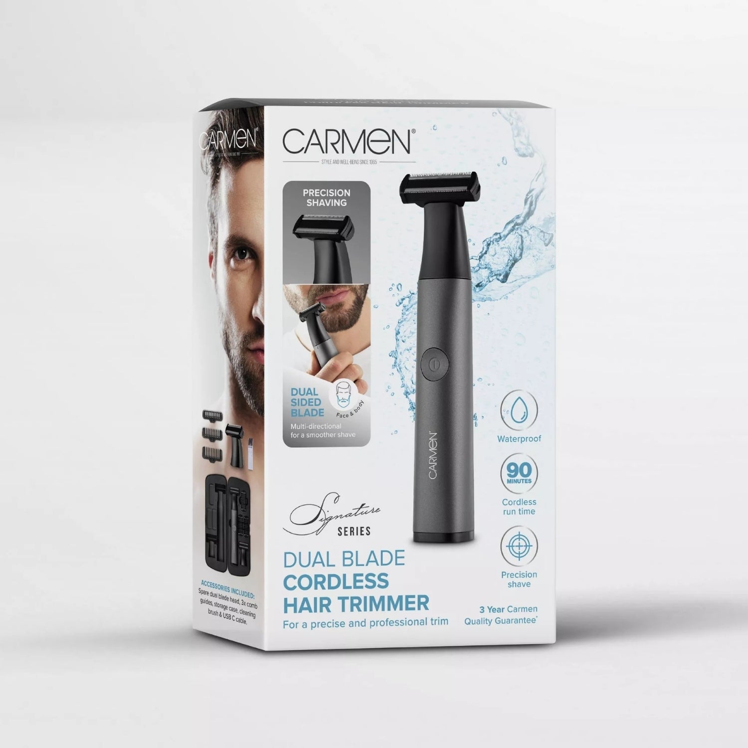 Upgrade your grooming toolkit with the Carmen Signature Dual Blade Hair Trimmer. Crafted with a dual-sided stainless steel blade system, this trimmer glides seamlessly along facial contours to deliver smooth, sharp lines and a professional finish. Whether you're trimming your beard, tackling stubble, or refining lines, this trimmer offers style, precision, and practicality in one smart package.