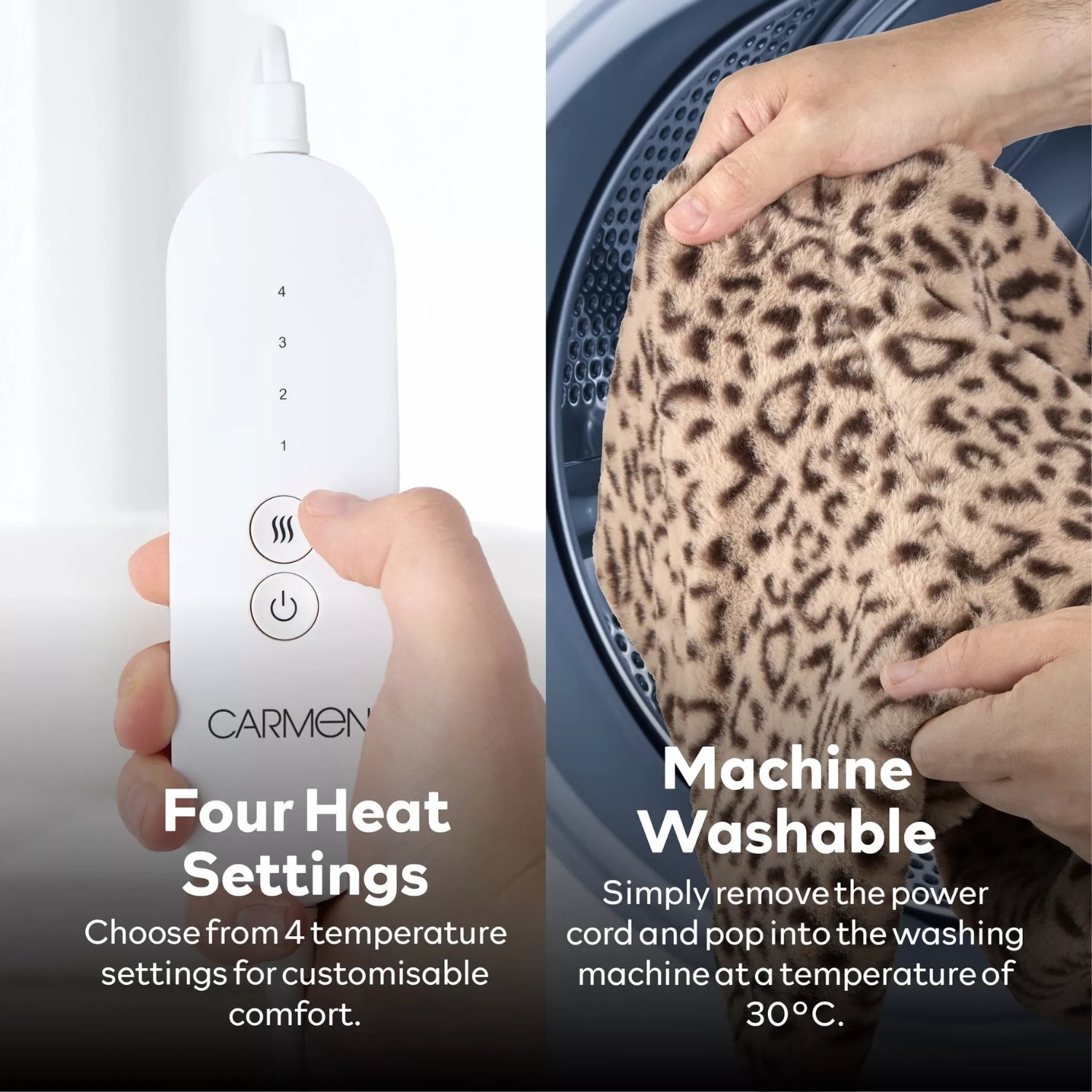 This stylish Carmen electric foot warmer in a leopard-print faux fur finish offers premium comfort and practical warmth for colder days. With its four heat settings and 110 W output, it quickly brings cosy heat to your feet, while the safety overheat protection gives you peace of mind. Perfect for relaxing evenings or keeping warm while working from home.