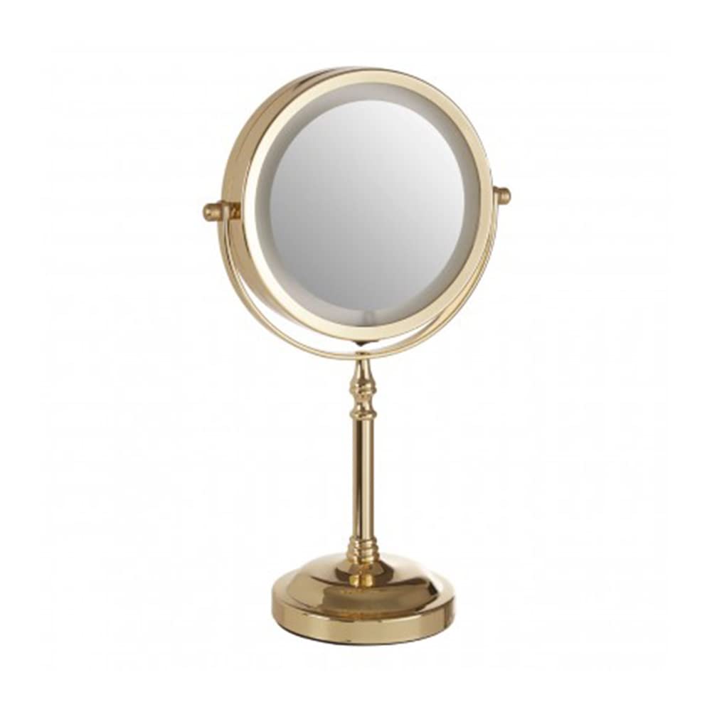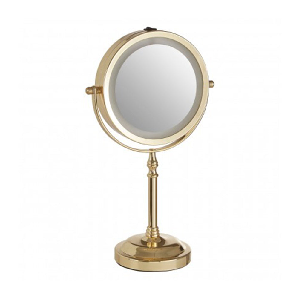 The Cassini table mirror is made from tough iron and has a reflective gold finish. Secured in a sling, one side of the mirror features 2X magnification. A black switch at the top operates the LED light.