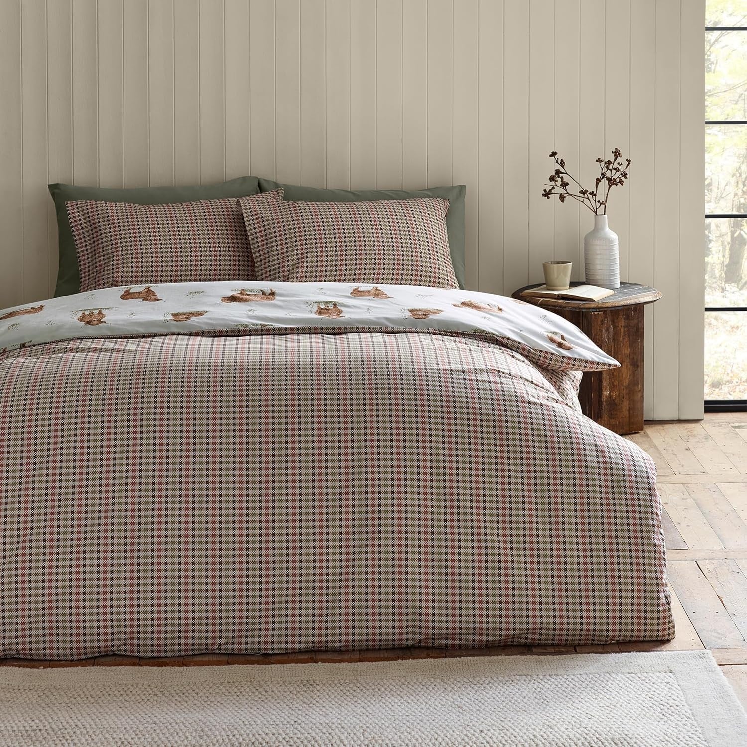 This easy-care and reversible duvet cover set can bring rustic charm to your bedroom with the angus the highland cow. It features a delightful repeat pattern of highland cows in a variety of poses and gingham design at the reverse. Material: 48% Cotton & 52% Polyester, it is machine washable. This set includes 1 x king duvet cover and 2 x pillowcases, duvet cover size is 230cm x 220cm (91" x 87") (Approx) and pillowcase size is 48cm x 74cm (19" x 29")(Approx).