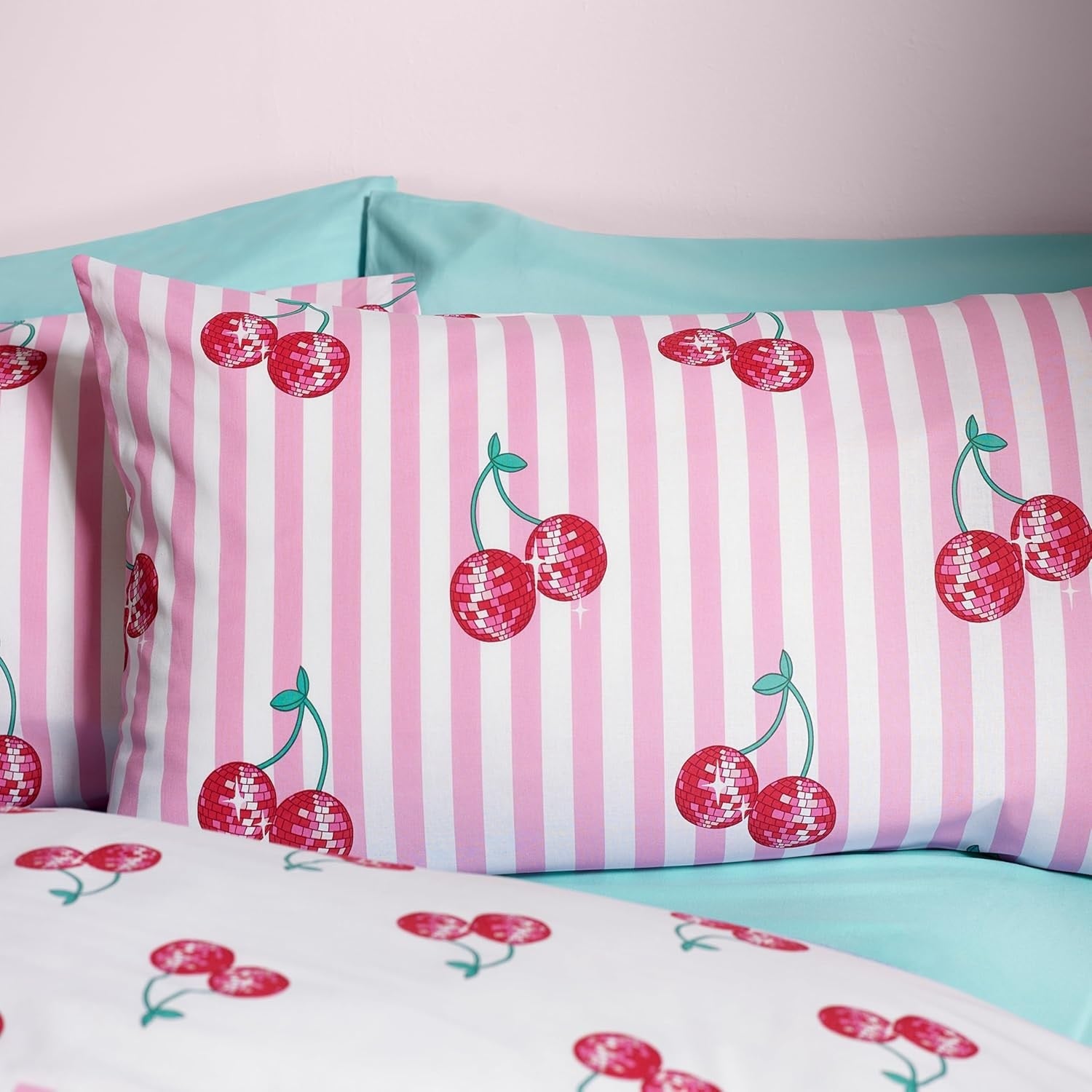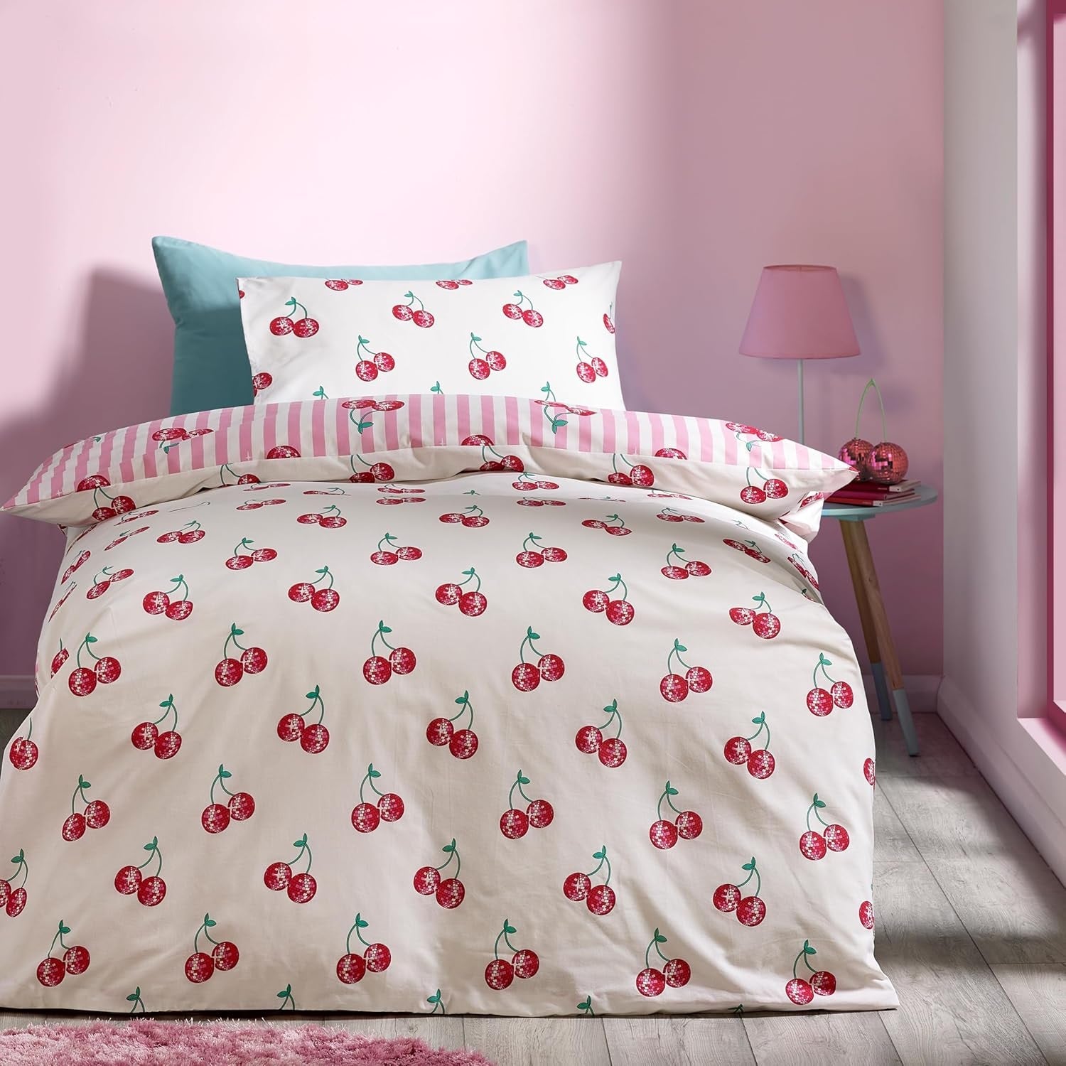 This easy-care and reversible duvet cover set brings a playful retro style to your bedroom with this vibrant cherry print bedlinen. It is featuring bold pink and white stripes paired with unique disco ball cherries, this fully reversible set adds a fun and fresh look to your space. Material: 48% Cotton & 52% Polyester, it is machine washable. This set includes 1 x single duvet cover and 1 x pillowcase, duvet cover size is 135cm x 200cm (53" x 79") (Approx) and pillowcase size is 48cm x 74cm (19" x 29")(Approx).