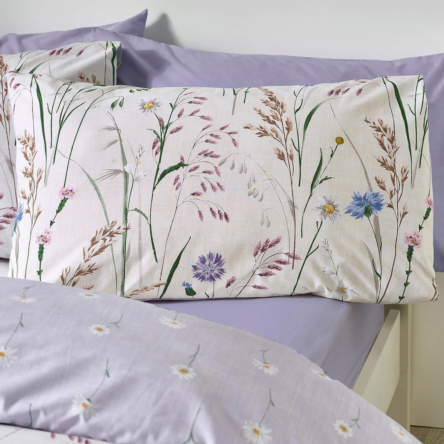 This easy care duvet cover set can bring a charming countryside feel to your bedroom, with this delicate floral meadow design featuring wildflowers and grasses on a soft cream background. Ditsy dasiy design on the reverse. Material: 48% Cotton & 52% Polyester, it is machine washable. This set includes 1 x king duvet cover and 2 x pillowcases, duvet cover size is 230cm x 220cm (91" x 87") (Approx) and pillowcase size is 48cm x 74cm (19" x 29")(Approx).