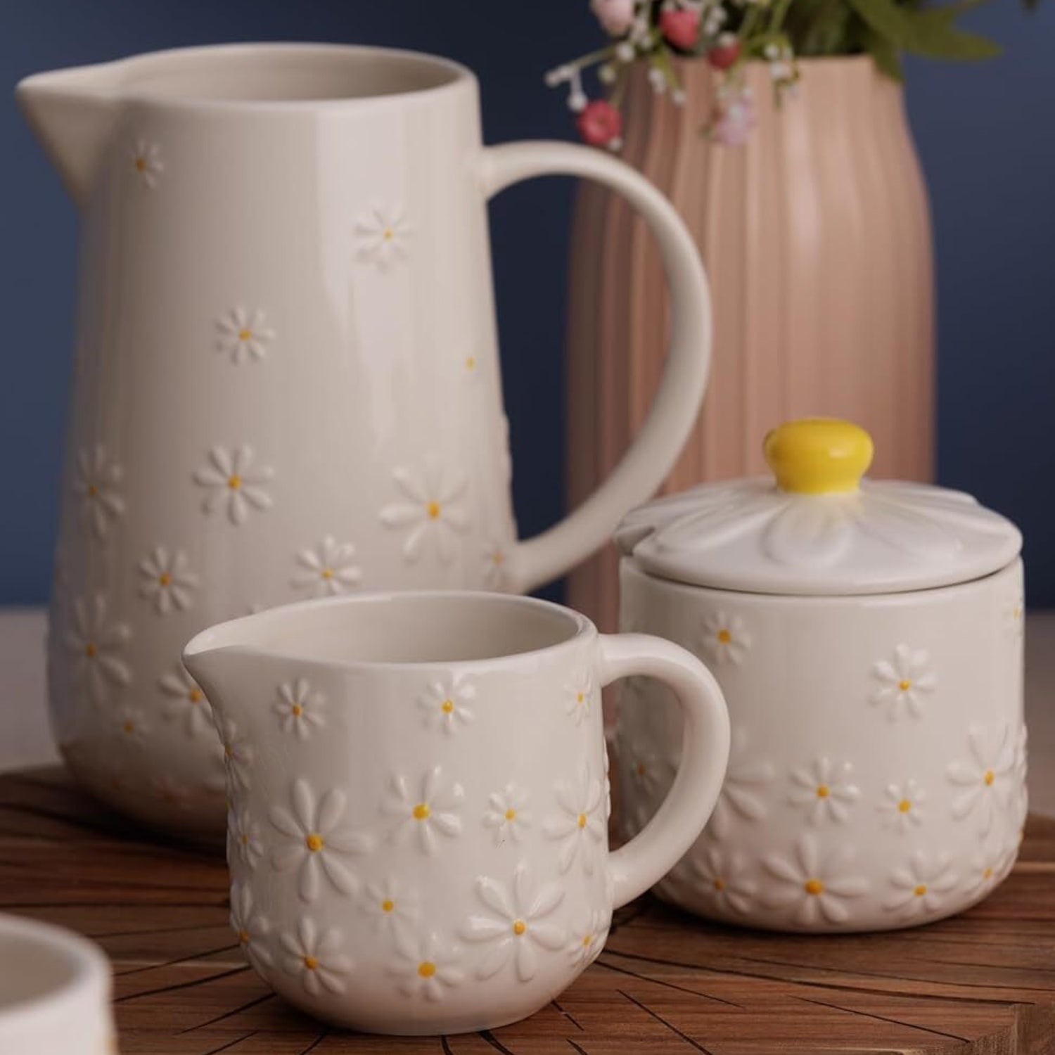Bring a touch of floral charm to your kitchen with the Daisy Sugar Bowl. Made from sturdy ceramic, it showcases an embossed daisy pattern and a flower-shaped lid topped with a bright yellow knob.