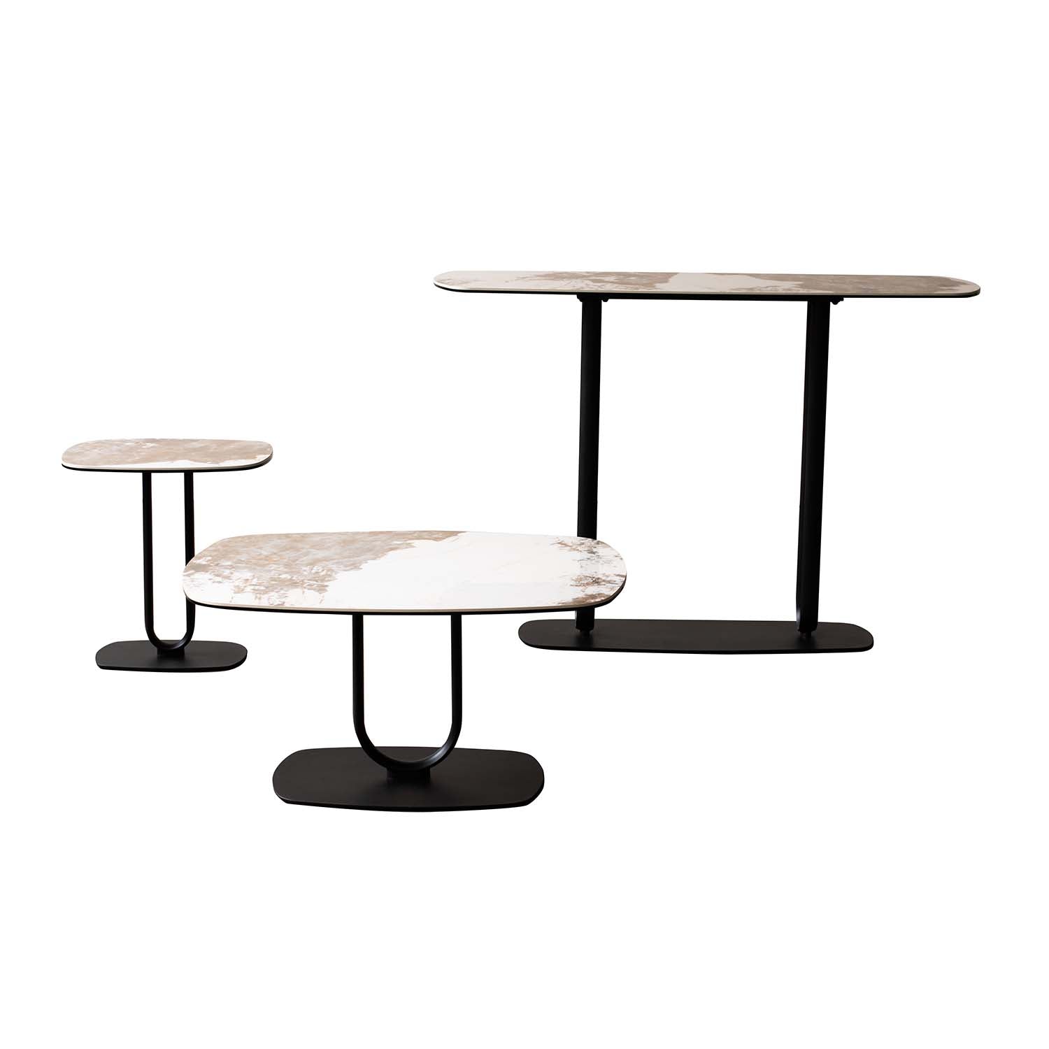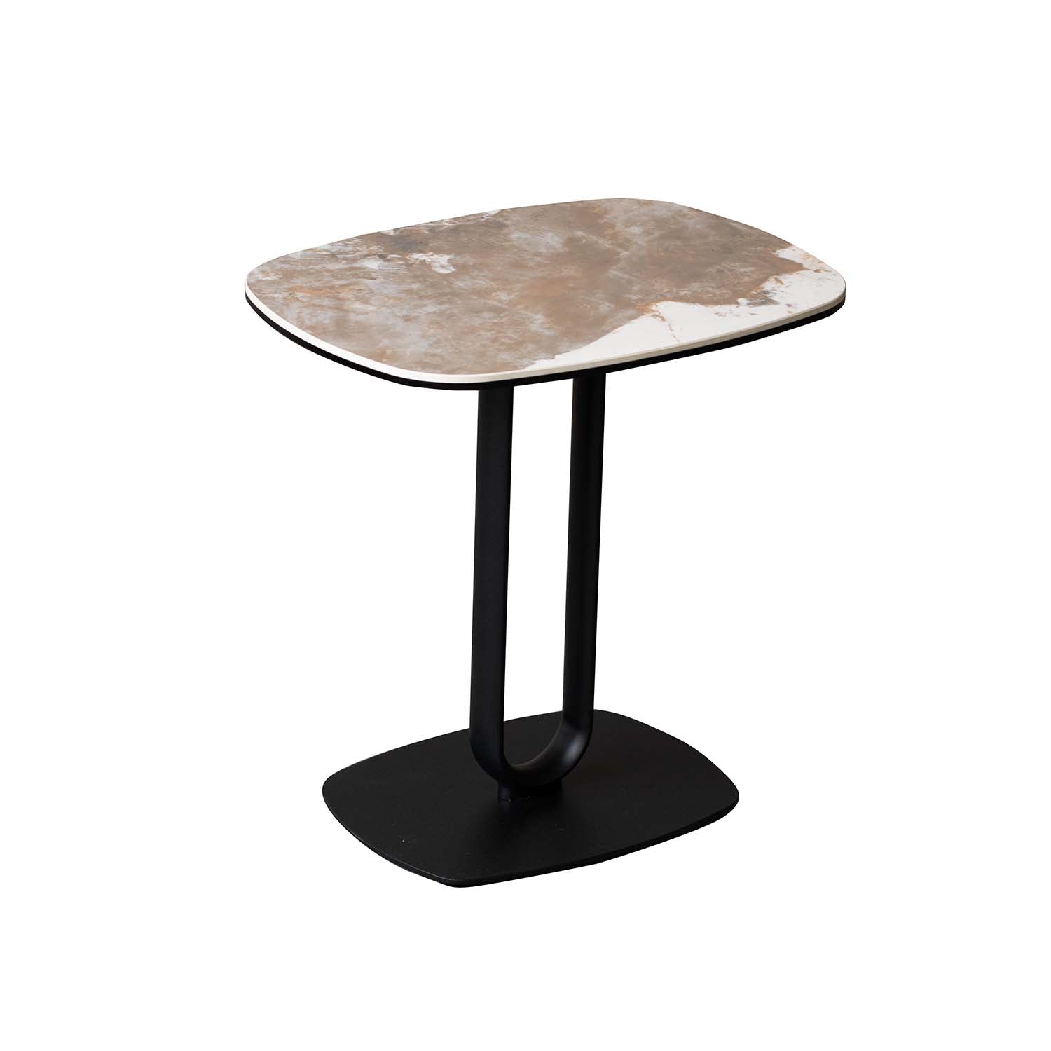 Elevate your living space with this modern ceramic glass side table featuring a Panlola 6mm ceramic + 6mm glass tabletop in a warm white and grey marble effect design. Supported by a sleek U-shaped metal base in matte black, this contemporary table is both compact and practical. Its minimalist design blends effortlessly into modern and industrial interiors, making it an ideal companion for your sofa, lounge chair, or bedroom corner. Assembly required.