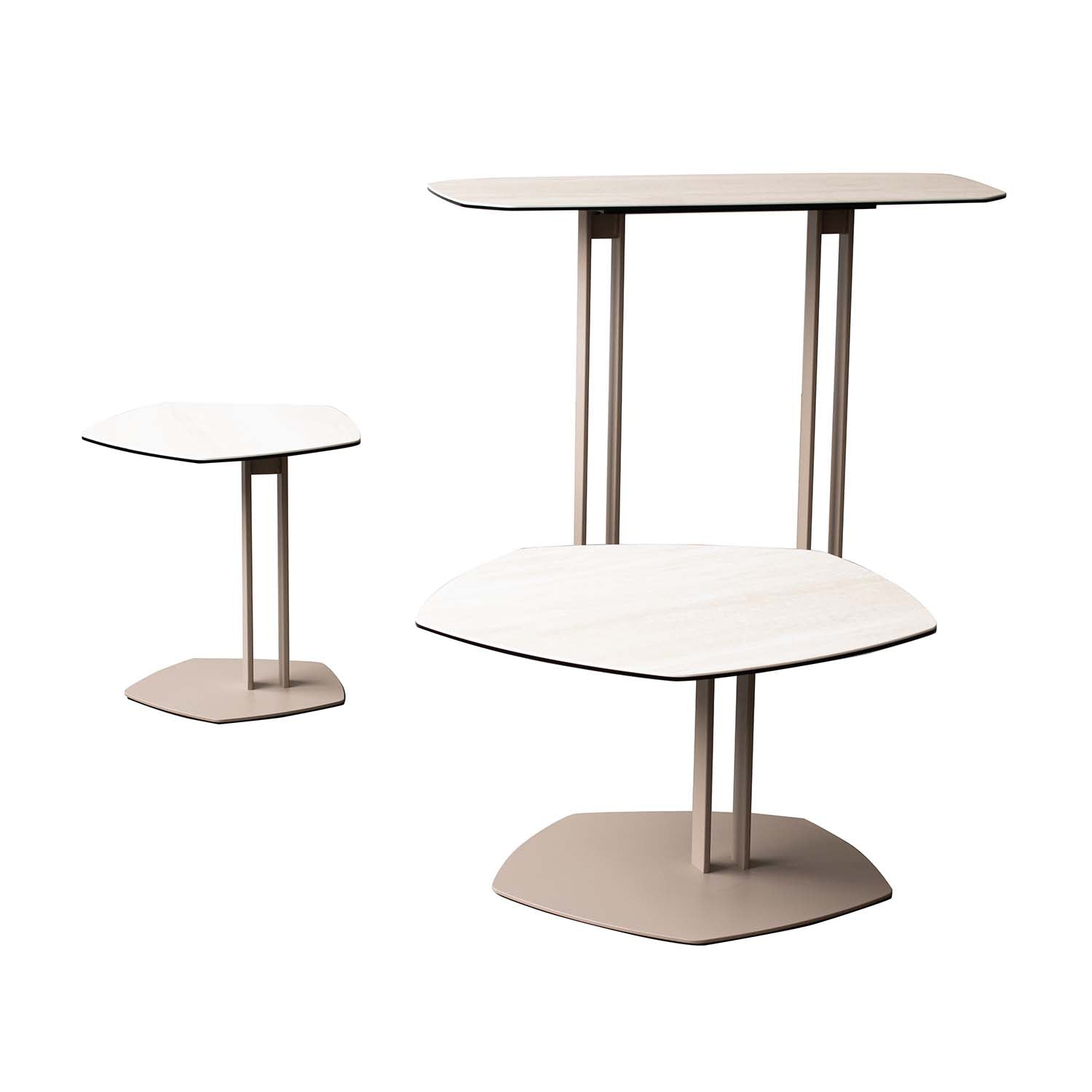 - Features a rectangular tabletop with soft rounded corners with travertine tones and stone-like pattern, paired with a cappuccino-coloured base with a flat plate for a sleek, contemporary look.