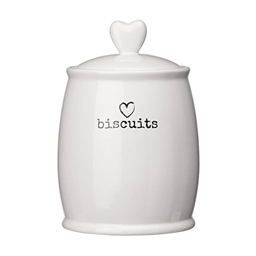 Bringing a kindly touch to your countertop, the charm biscuit canister, with love heart detail and lid, will help to keep your kitchen organised and tidy. Made from durable white dolomite, the barrel shaped canister features an elegant love heart design and worded 'biscuits' detail giving the jar a gentle style, while ensuring easy identification. Matching the canister is the delightful lid, which is accentuated by the love heart handle, that fits neatly on top helping to keep your biscuits, cookies and other sweet treats fresh for longer. Complementing most decors, the charm biscuits canister will add a fresh look to your kitchen while ensuring your everyday essential is close to hand.