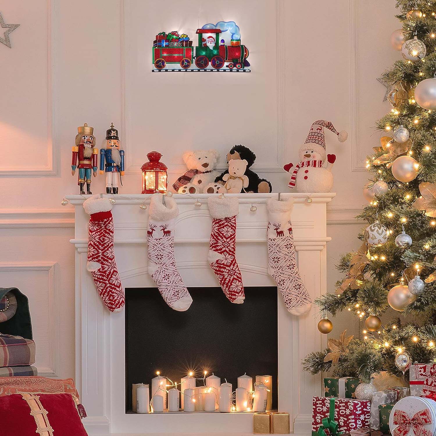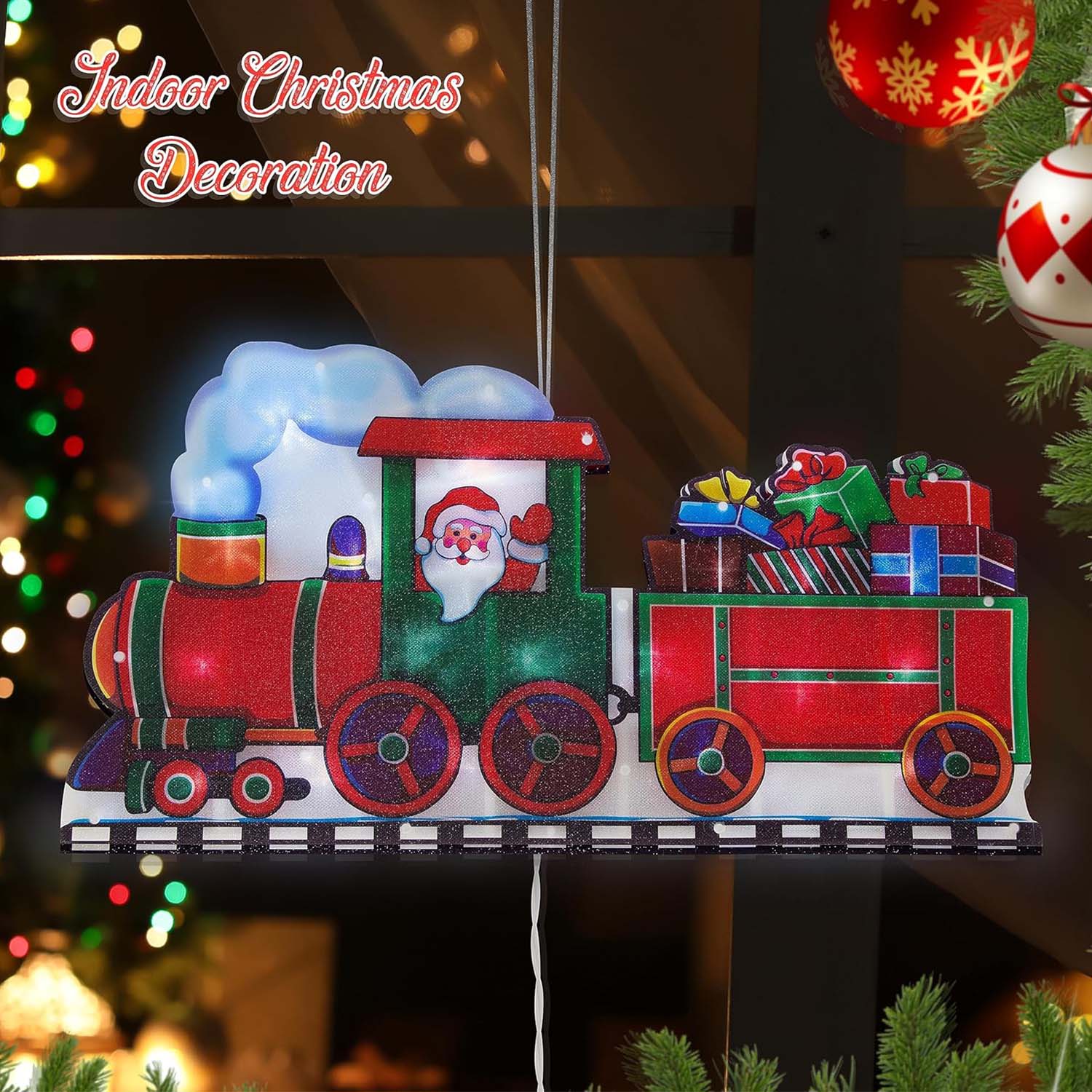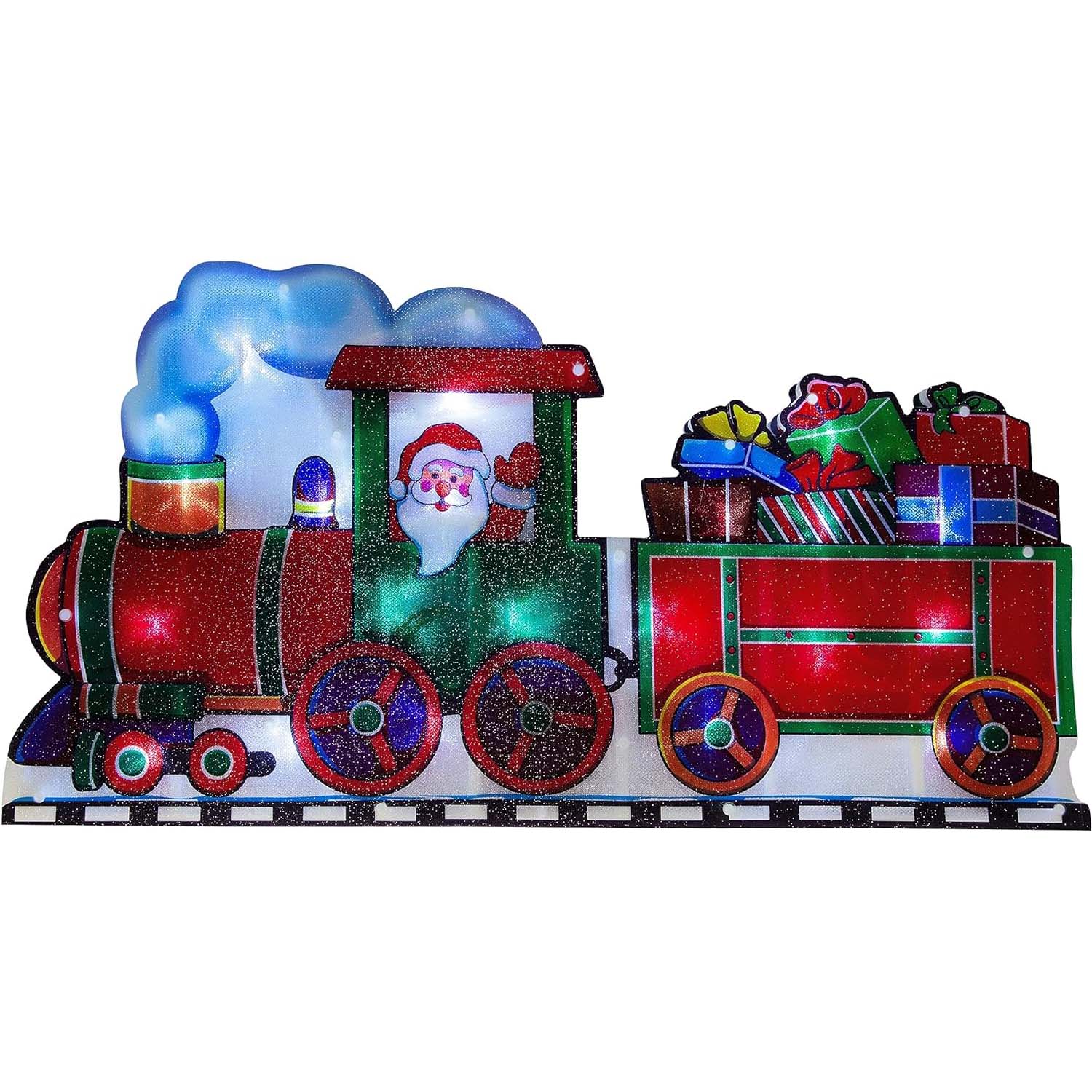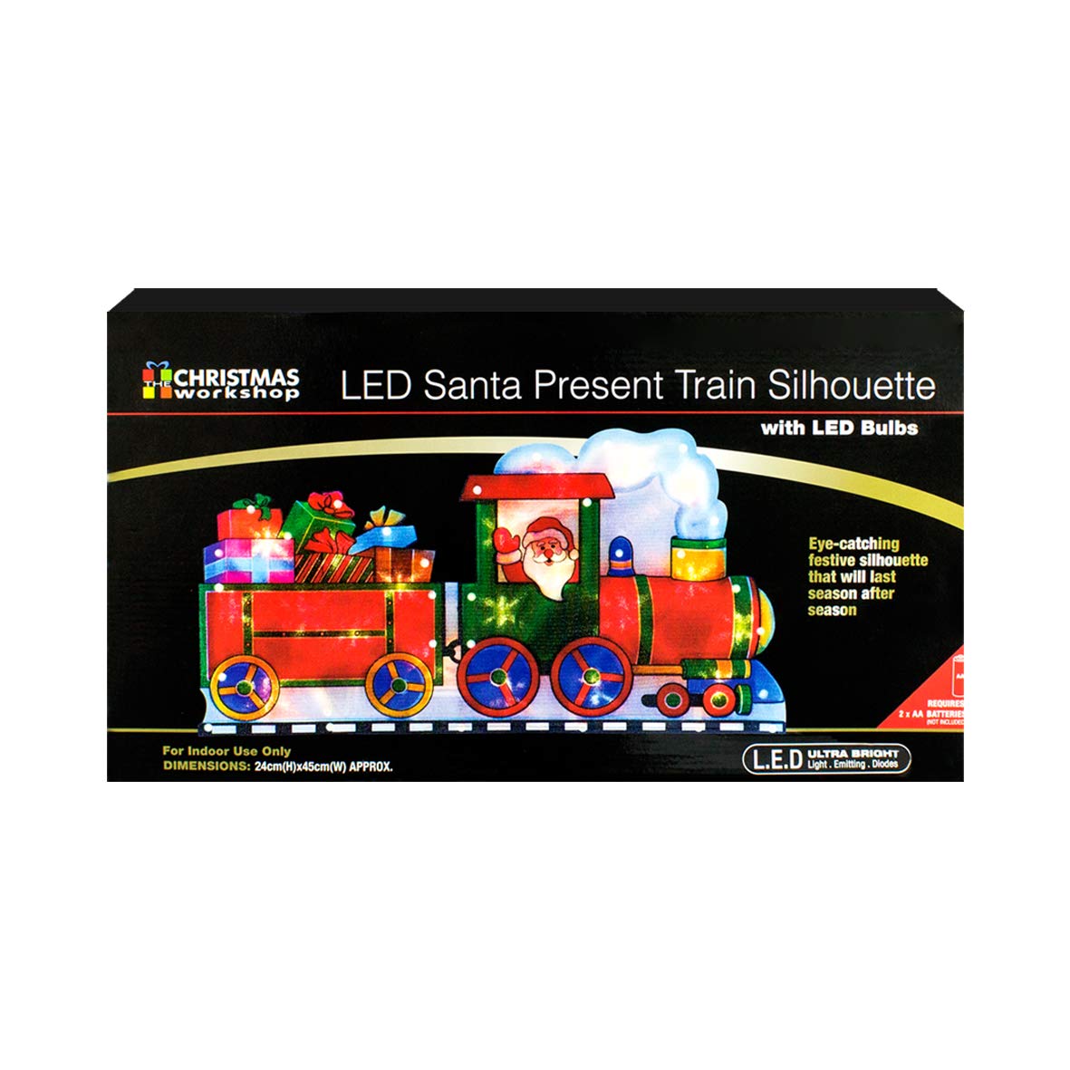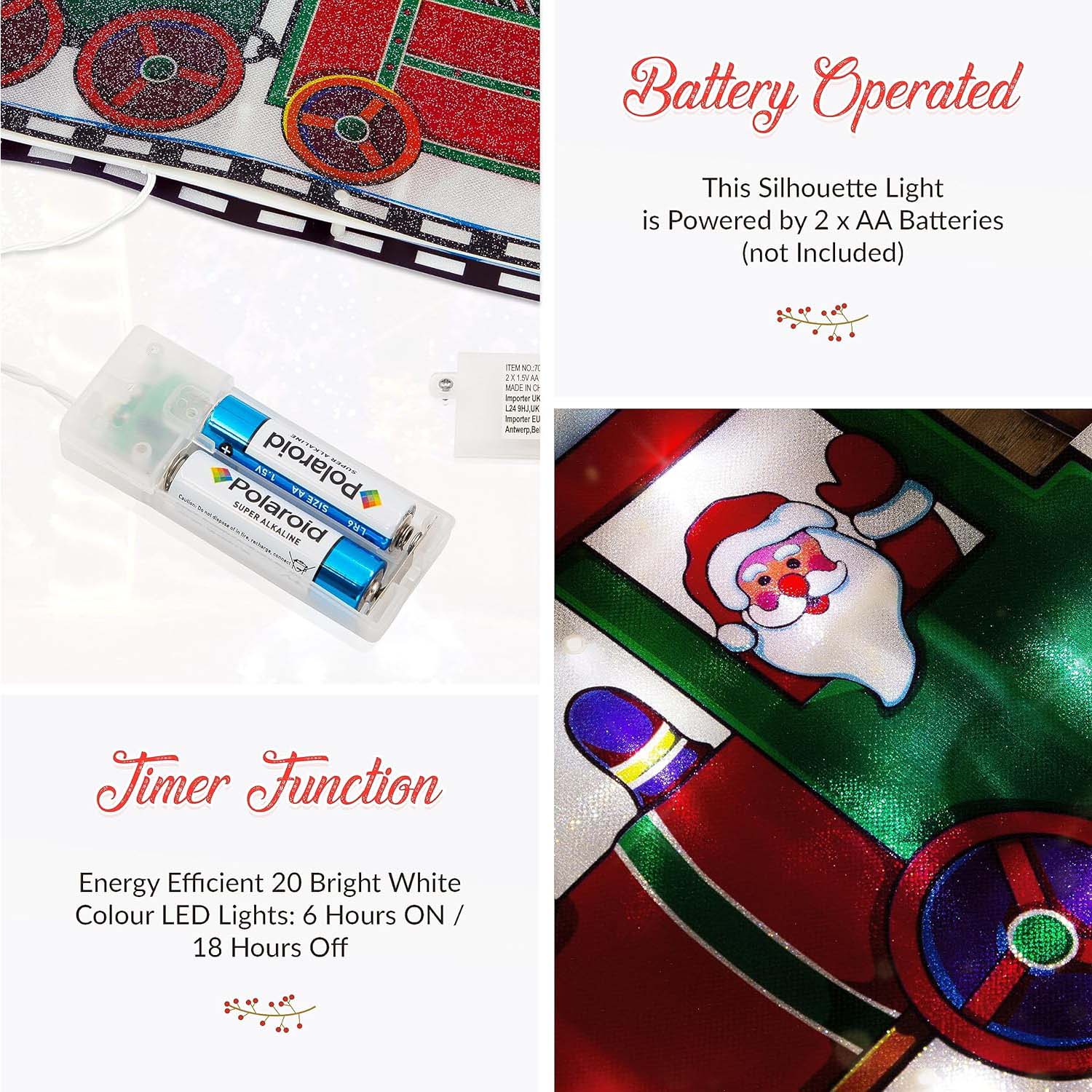 This lovely Window Silhouette features a decorated Santa Claus in a train with rich colors and LED lights to enhance the overall piece. Perfect for both indoor and outdoor use. Ideal for lighting up your home, Christmas trees, garden, and more. It measures 46cm in height by 61cm in width. With 20 bright white LED lights situated around the ornament giving it that warm glow. The lights are powered by 3x AA batteries (not included).