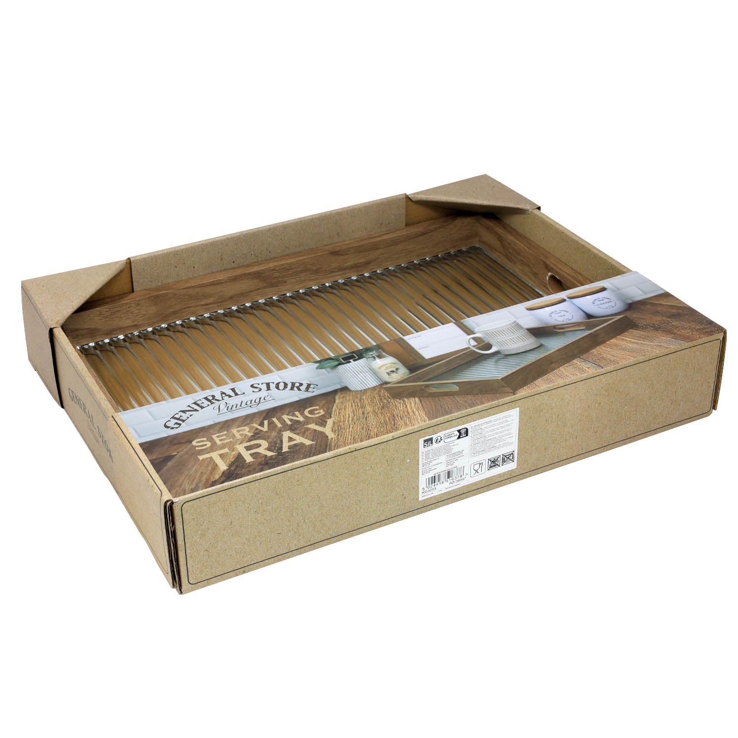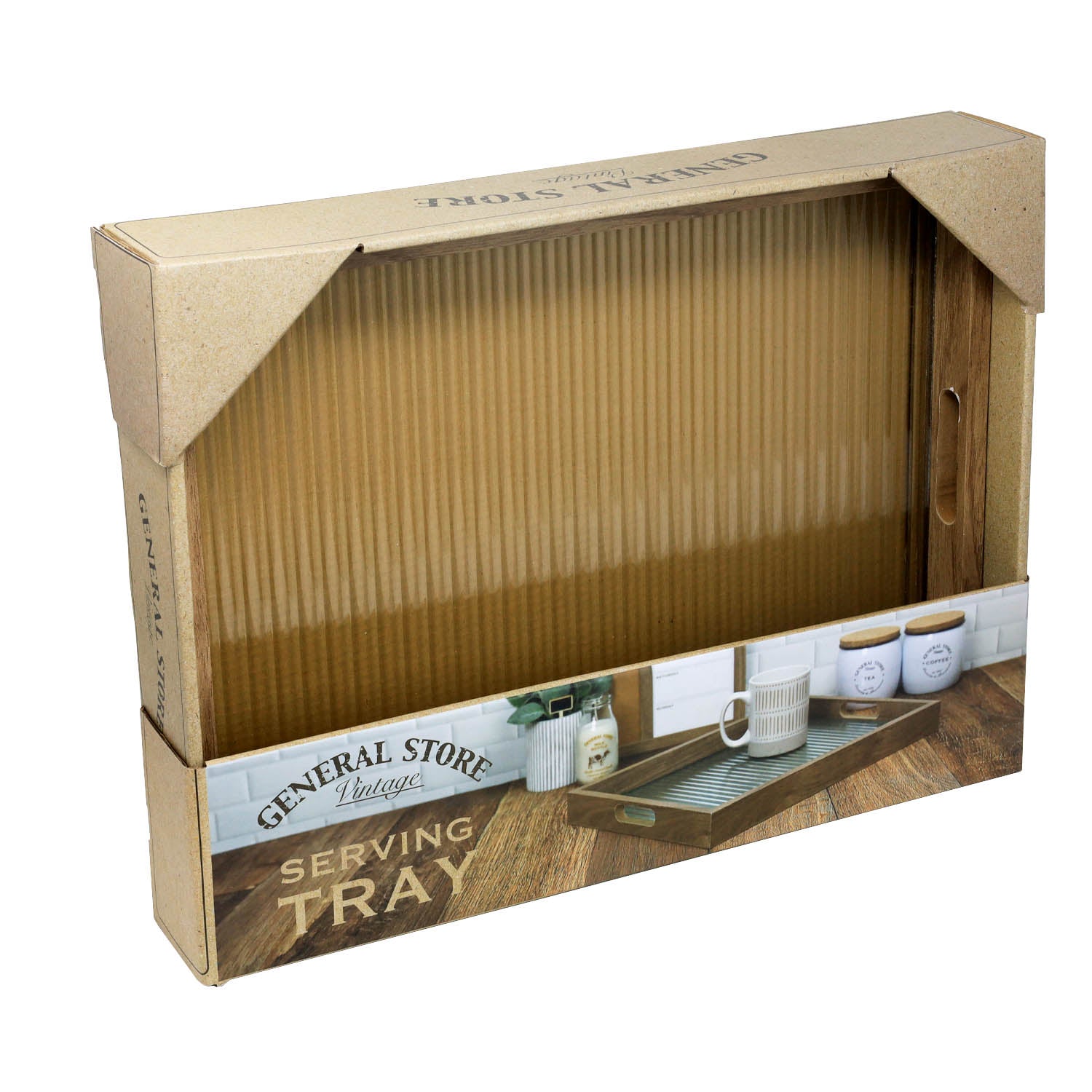 Serve in style with this elegant rectangular serving tray made from wood and ribbed glass. Featuring integrated handles and a clear textured base, this 4cm tall tray adds charm and functionality to your home. Not safe for microwave or dishwasher; wipe clean only.