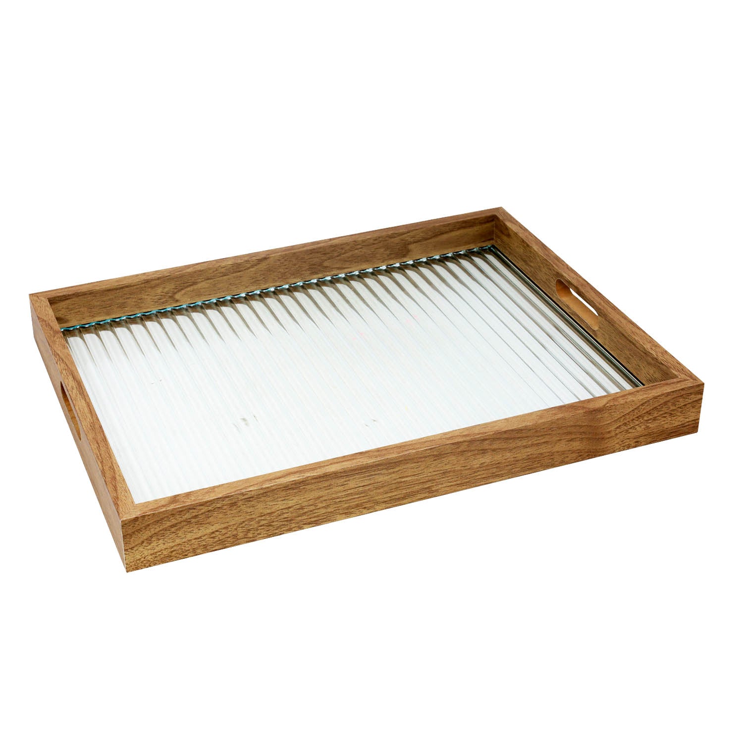 Clear Ribbed Glass Base Wooden Serving Tray with Handle