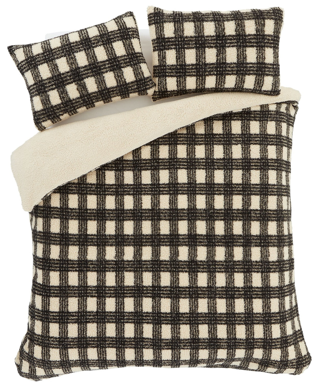 Cosy Borg Sherpa Check Duvet Cover Set, Double, Natural & Black
