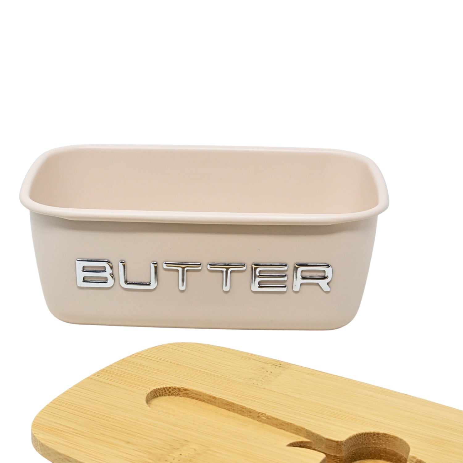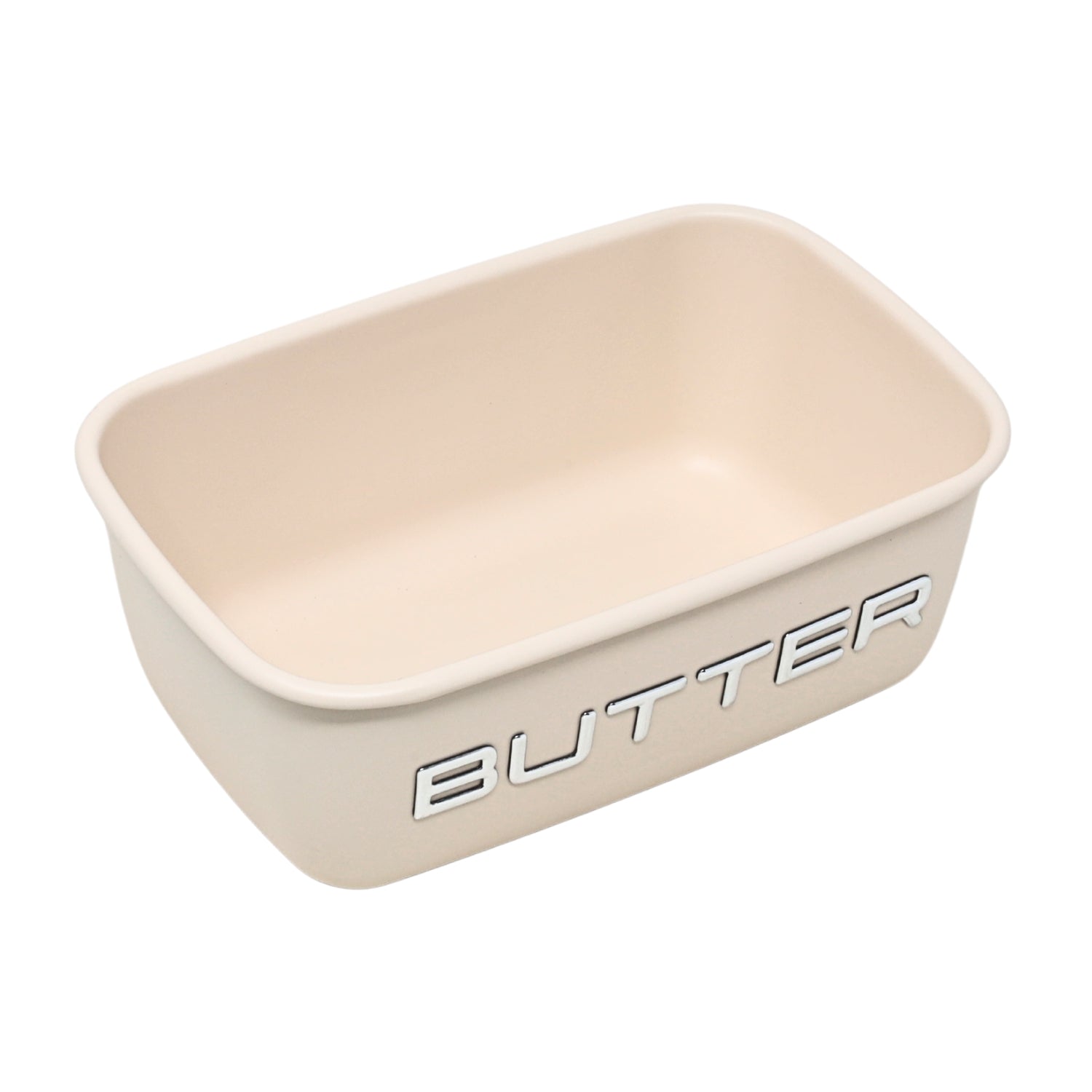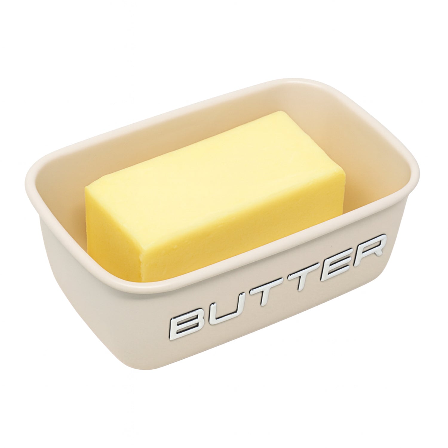 - Rectangular shape in a classic cream tone, accented with embossed chrome letters spelling “BUTTER” for a modern kitchen aesthetic.