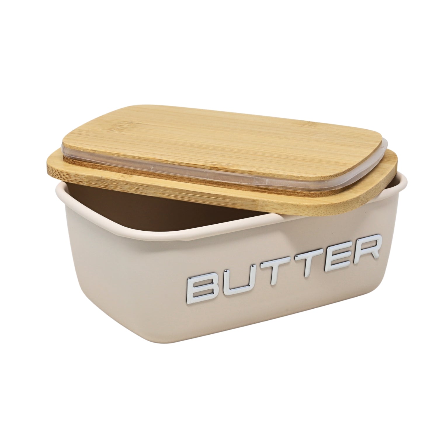 Keep your butter fresh and beautifully stored with this classic cream metal butter dish featuring a natural wooden airtight lid with silicone seal and chrome embossed BUTTER lettering. The lid includes a slot for the included utensil, making serving easy and stylish. Its rectangular design fits perfectly on any kitchen counter or dining table. Crafted from durable metal with a matte finish, this butter dish is the perfect blend of functionality and elegance.