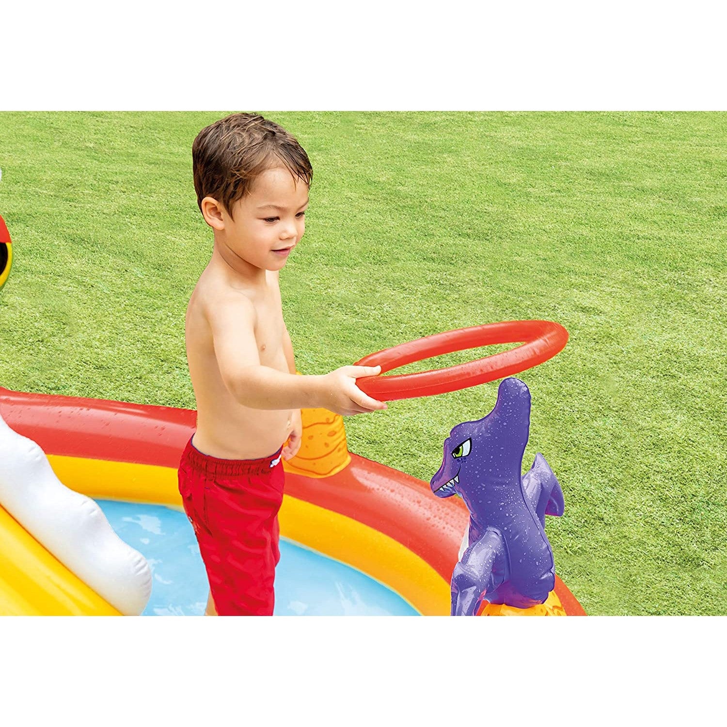You're ready to enter the Jurassic world. If your little one is passionate about dinosaurs, with this Intex game center, it is recommended for children over 2 years of age weighing less than 54 kg and it is recommended to install it in outdoor spaces such as the terrace, garden or patio. The pool has a capacity of 150 litres of water, has 11 independent air chambers that ensure greater safety and is made of durable PVC.This circular shaped pool is divided into two parts, in the middle is the head of the T-REX with its mouth open. Its sharp fangs guard a long slide tongue through which to throw yourself into the pool. It has a padded carpet so that kids do not get hurt when they fall. It is impossible not to get wet in this water play center. Rocks and vegetation are sprinklers that get you wet when you go down the slide. But the adventure does not end there, in this wild pool inhabit creatures like the inflatable pterodactyl, which is perched on a rock watching. Grab the air ring and throw it to catch it.The pool includes a nozzle to connect the garden hose, a drain plug to drain water, and a repair patch in case the tarpaulin is pricked at any time.You can inflate the game center in record time with an Intex electric or manual pump sold separately. So your kids can start with the adventure.