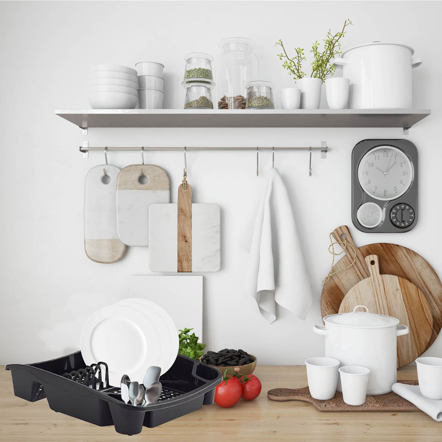 Compact dish drainer for drying your dinnerware without a hassle. Made from plastic for durability.