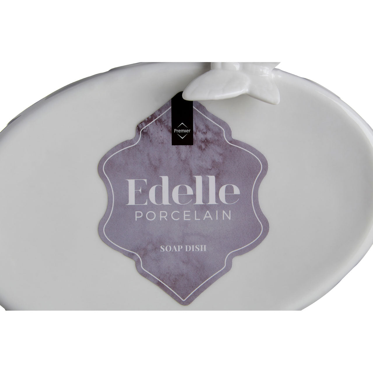 The Edelle soap dish is made from smooth, non-porous porcelain. It has an oval design and features embossed leaf detailing that complements the butterfly and also lends texture to its outer surface. Part of the Edelle bathroom range, this dish is a graceful way to prevent soap from leaving marks on surfaces.