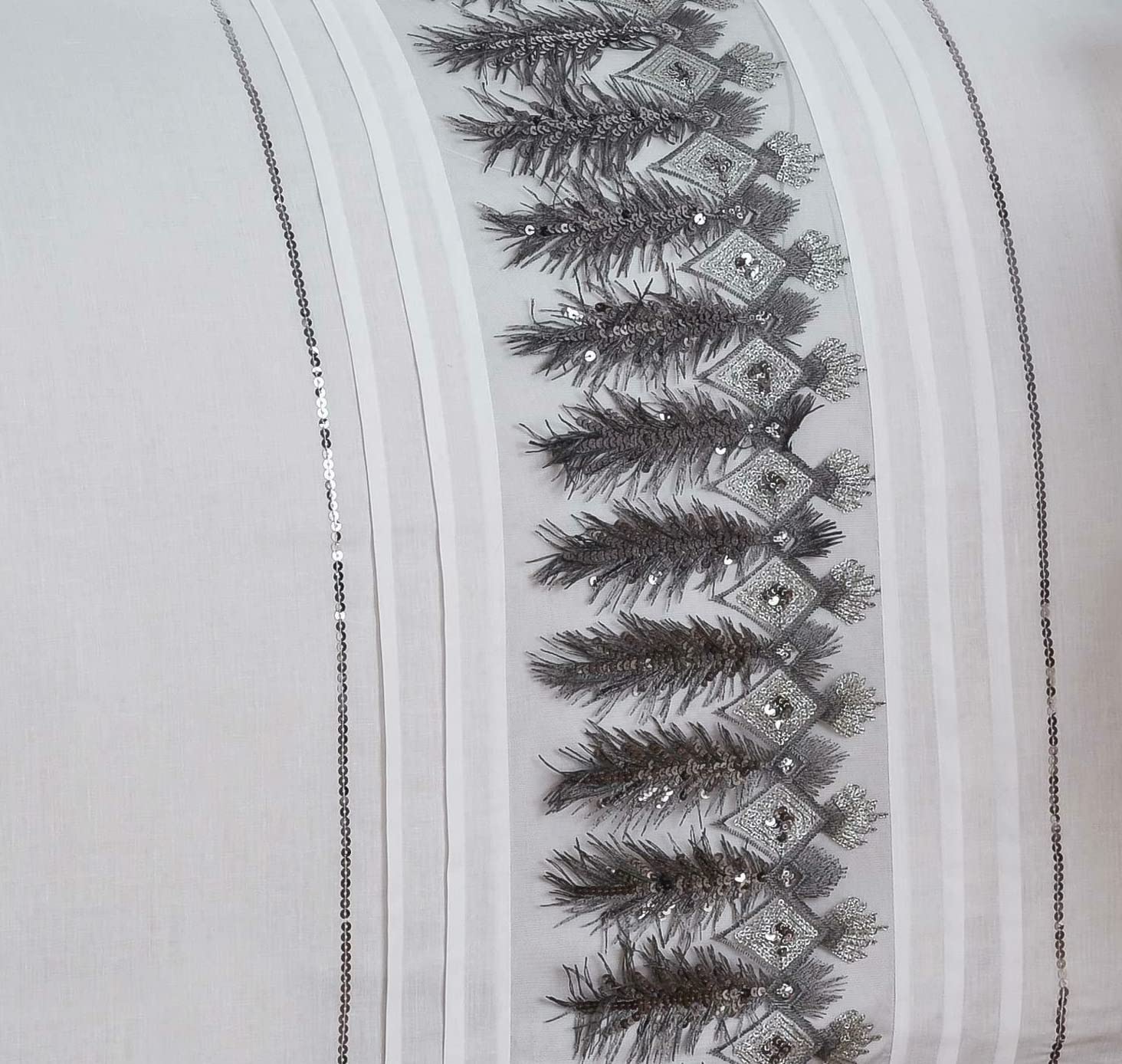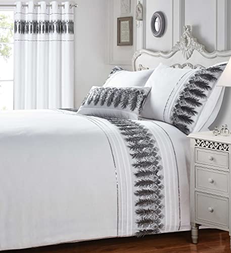 This luxury & modern super king duvet cover set has embroidered feathers design on it. Create a gorgeous look in your bedroom with white and silver grey feathers design. It has sparkle sequin and pintuck detail on it. Material: 50% Cotton & 50% Polyester, it is machine washable. This set includes 1 x duvet cover & 2 x pillowcases, duvet cover size is 260cm x 220cm (102" x 87") (Approx) & pillowcase size is 48cm x 74cm (19" x 29")(Approx).