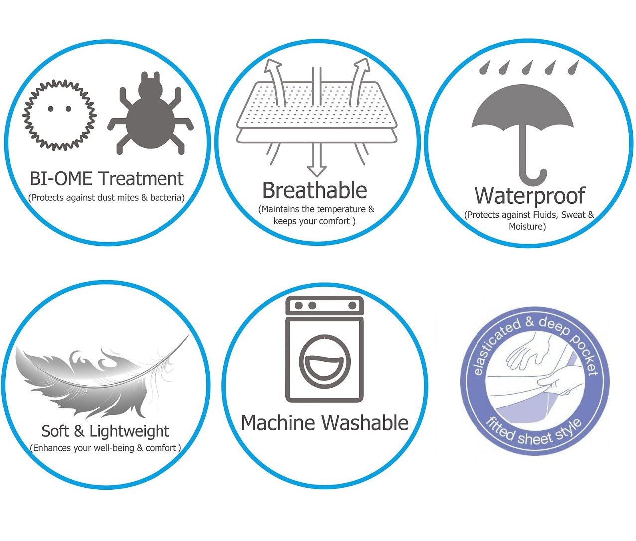 Every night, while at sleep, the body releases skin flakes and body fluids that accumulate in a mattress. This mattress protector is an antimicrobial barrier between you and the mattress. It draws moisture away from skin to help balance body temperature. Protector fabric retains its natural softness to give you an extra luxury. It is capable of withstanding wear and tear or decay, a durable fabric, able to perform or compete over a long period, as by avoiding and overcoming damages to your mattress. It can be fit on most of the mattresses up to 34cm. Material is Polyester, it is machine washable.