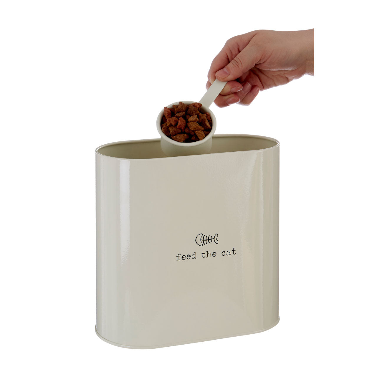 With its natural colouring and cheerful type and graphics, this pet food storage tin is a beautiful alternative to plastic and paper packaging. Made from tough galvanised steel, its powder coating further enhances its durability. The lid keeps the contents fresh, while a coordinating spoon makes it easy to scoop the contents into a bowl. 2.8-litre capacity. Product dimensions: H22 x W20 x D10cm