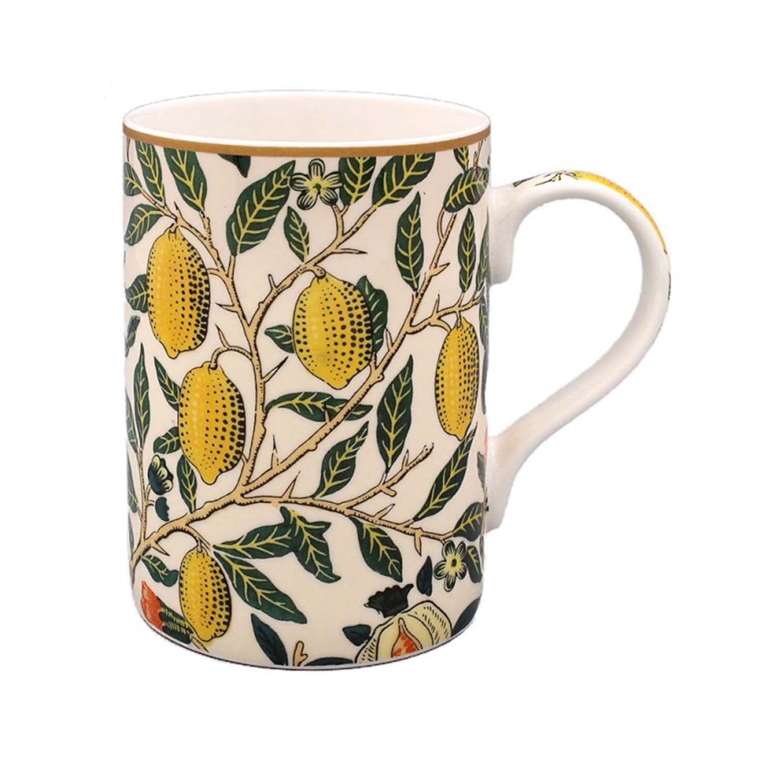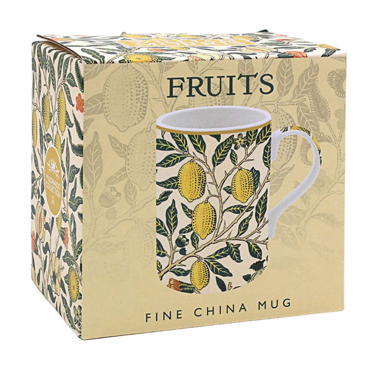 Elevate your daily coffee or tea experience with this exquisite Fine China Fruits Mug featuring a timeless William Morris "Fruits" lemon and leaf design. This elegant 300ml ceramic mug boasts vibrant, detailed artwork on a pristine white background, complete with a matching handle. Perfect for home or office, it’s both microwave and dishwasher safe, making it a functional and a thoughtful gift for any occasion.