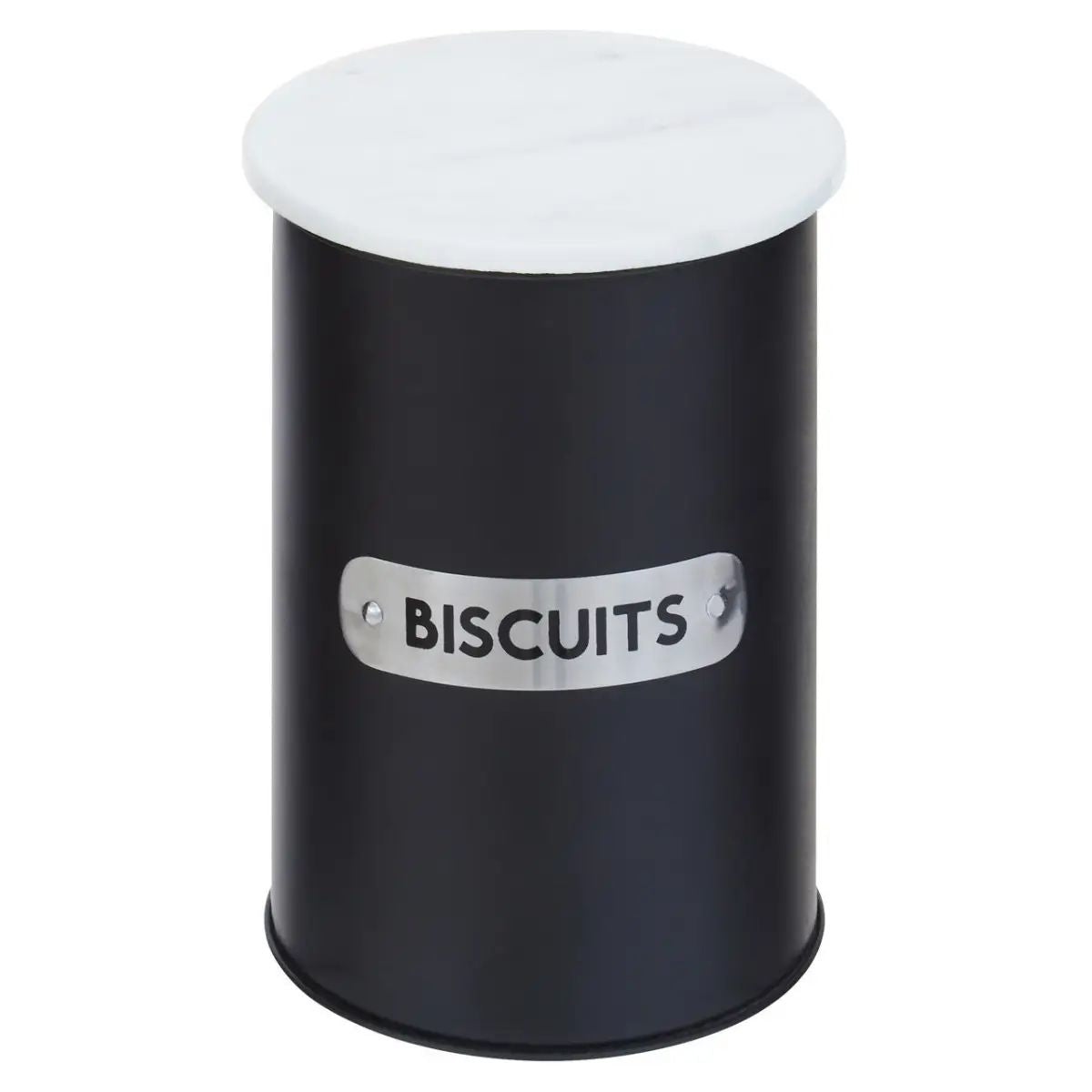 Enhance your kitchen's sophistication with the smooth black enamel body and white marble lid of the Liberty Biscuit canister.